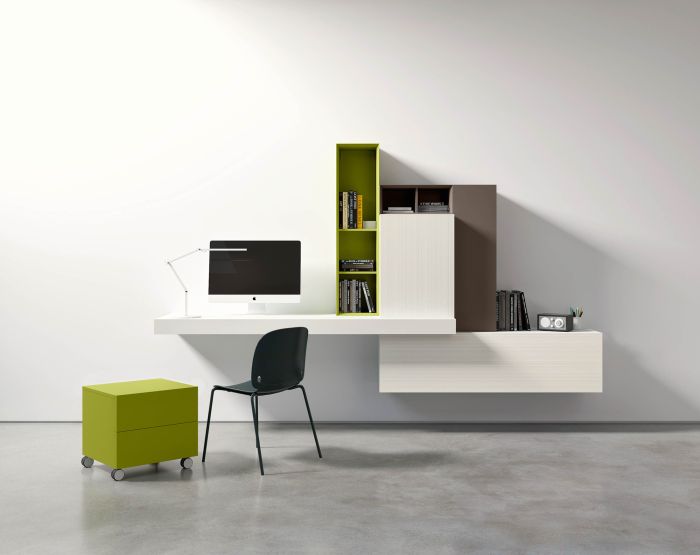 Composizione da L 300 x P 55 x H 195 cm con moduli con struttura e frontali battente laccato opaco bianco, cappuccino, modulo con struttura e frontale ribalta Matt Alaska, moduli a giorno laccato opaco cappuccino e bamboo, pedana laccato opaco bianco, modulo cassetto su ruote laccato opaco bamboo.