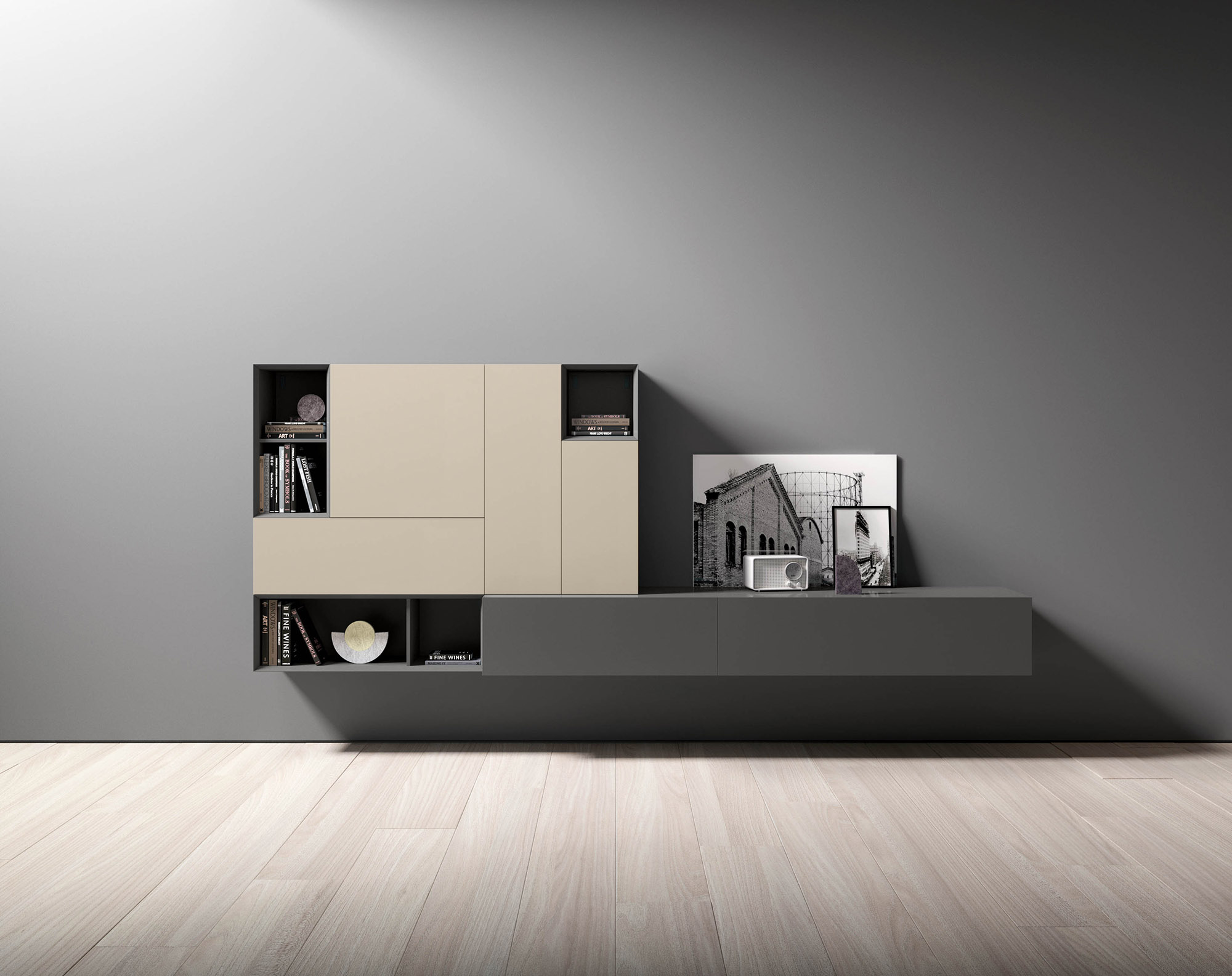 Composizione da L 300 x P 45 x H 155 cm con moduli con struttura laccato opaco piombo, frontali battente e cassetto laccato opaco tortora, moduli ribalta laccato lucido piombo, moduli a giorno laccato opaco piombo.