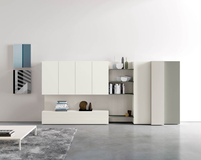 Composizione da L 330 x P 45 x H 151 cm con moduli con struttura laccato opaco bianco e frontali battente laccato opaco bianco, fumo e nuvola, modulo cassetti Matt Alaska, boiserie Matt Alaska con mensole laccato opaco fumo.