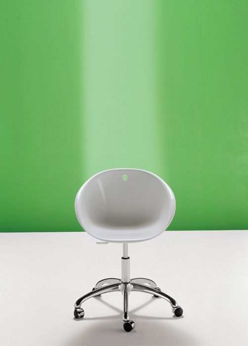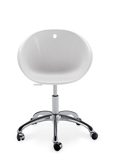 Coppia di sedie con scocca in tecnopolimero bianco o sabbia accessoriabile con cuscino sfoderabile in tessuto o pelle. Base girevole in pressofusione di alluminio lucidato con ruote e alzata a gas.
