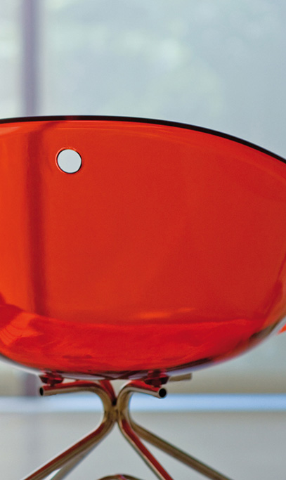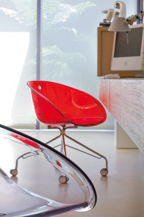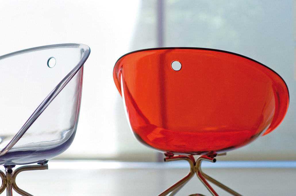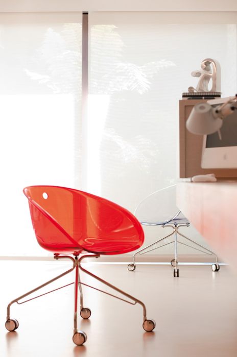 Coppia di poltroncine Gliss con scocca in policarbonato trasparente su ruote. Telaio in tubo d’acciaio cromato Ø16 mm.