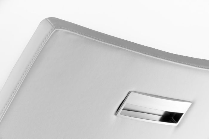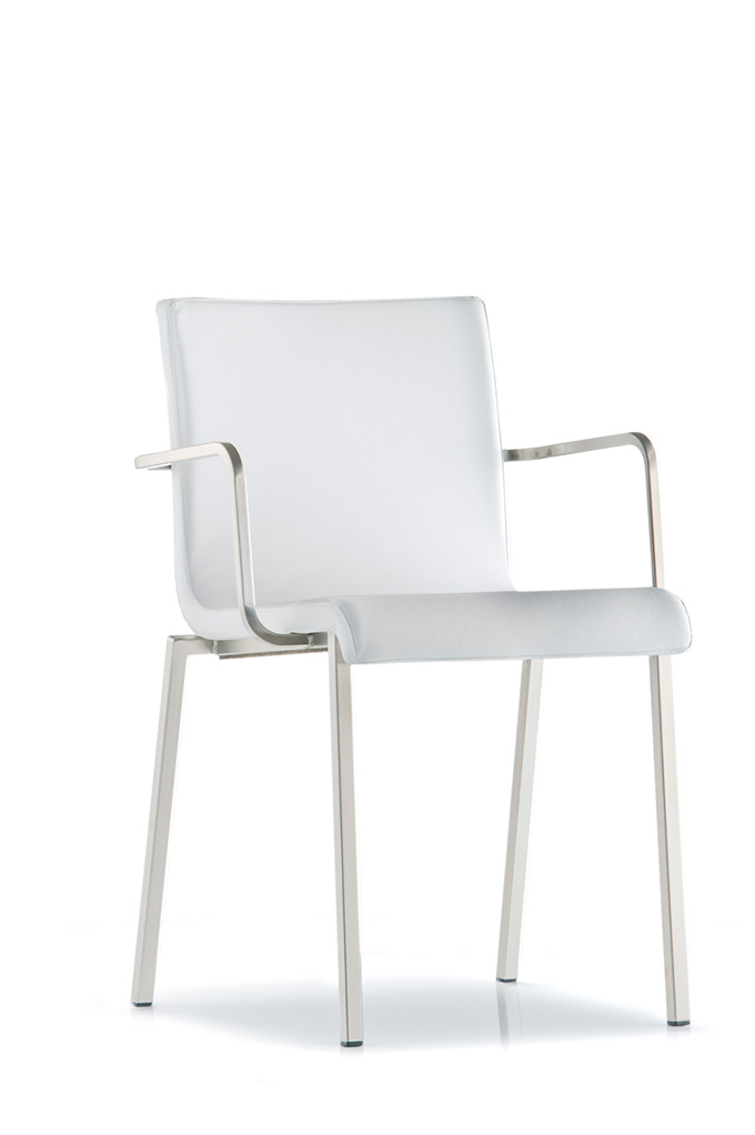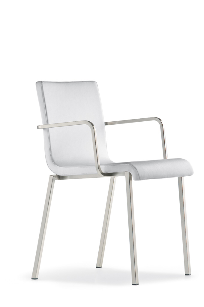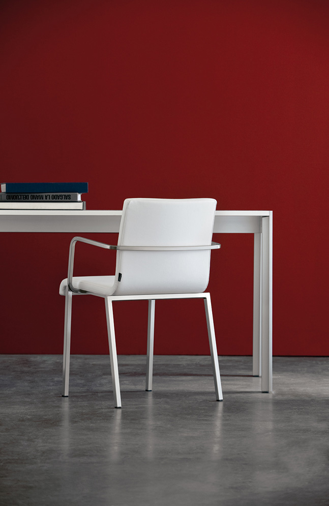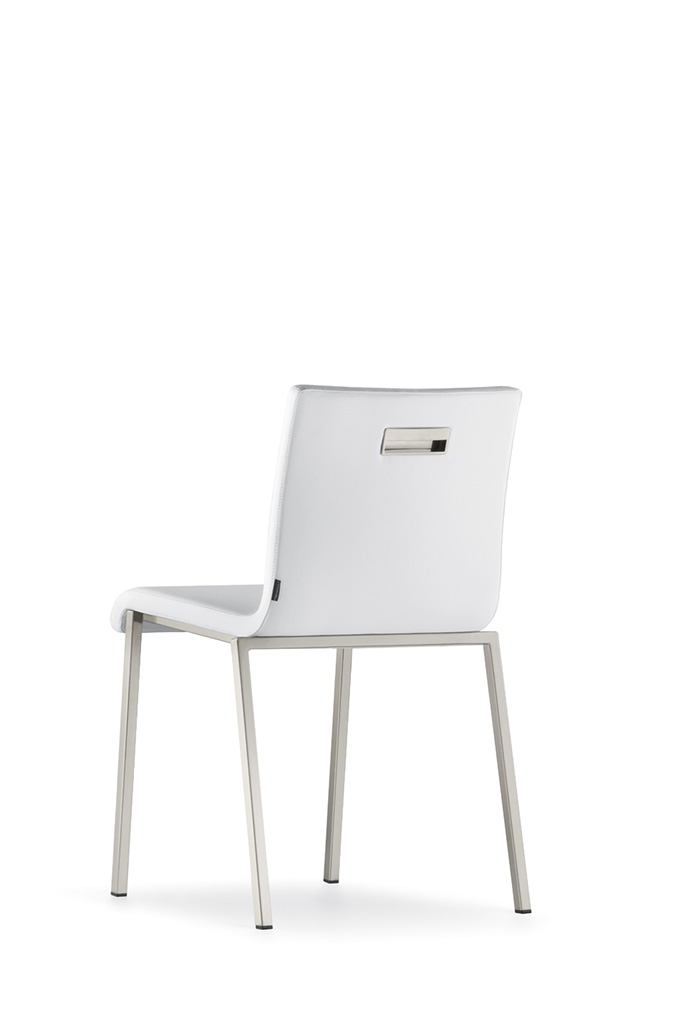 Coppia di sedie con scocca imbottita in diversi colori. Telaio in tubolare d’acciaio satinato 20x20 mm.