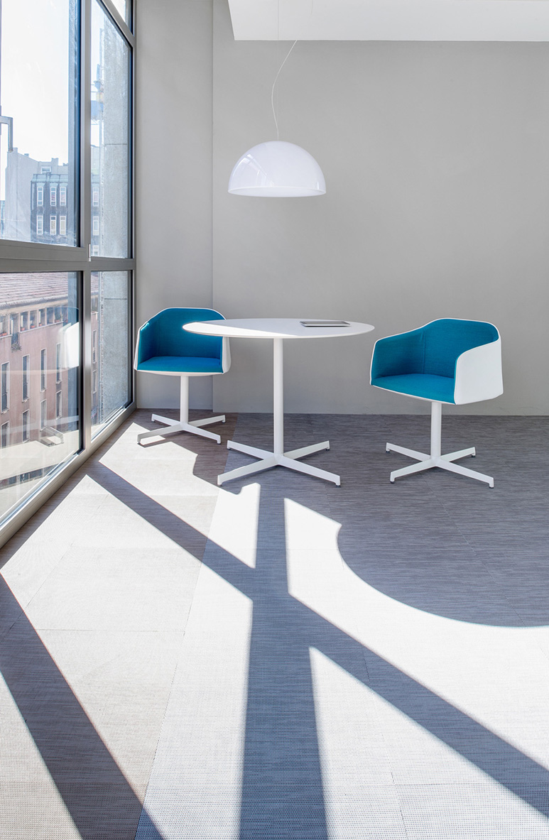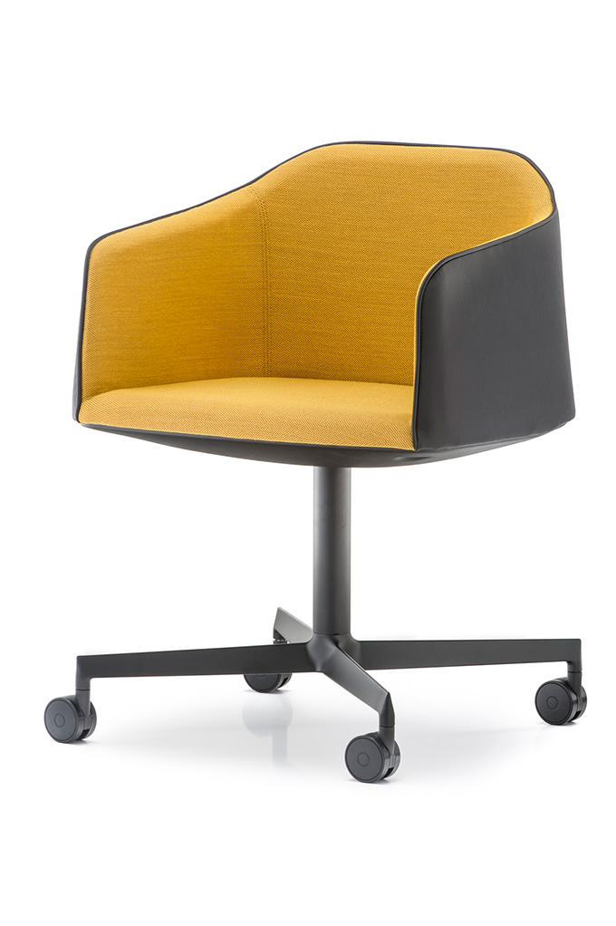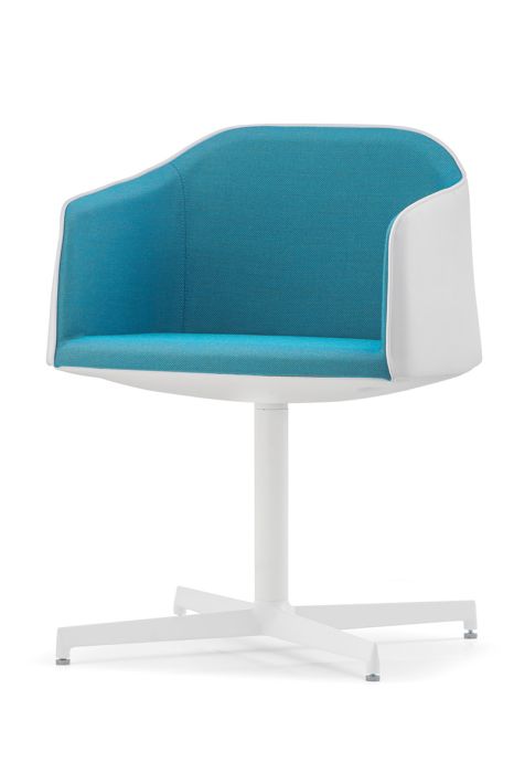 Coppia di sedie dotate di base a 4 razze in pressofusione di alluminio verniciata bianca e nera oppure proposta nella finitura lucida, può essere rivestita in tessuto o finta pelle.