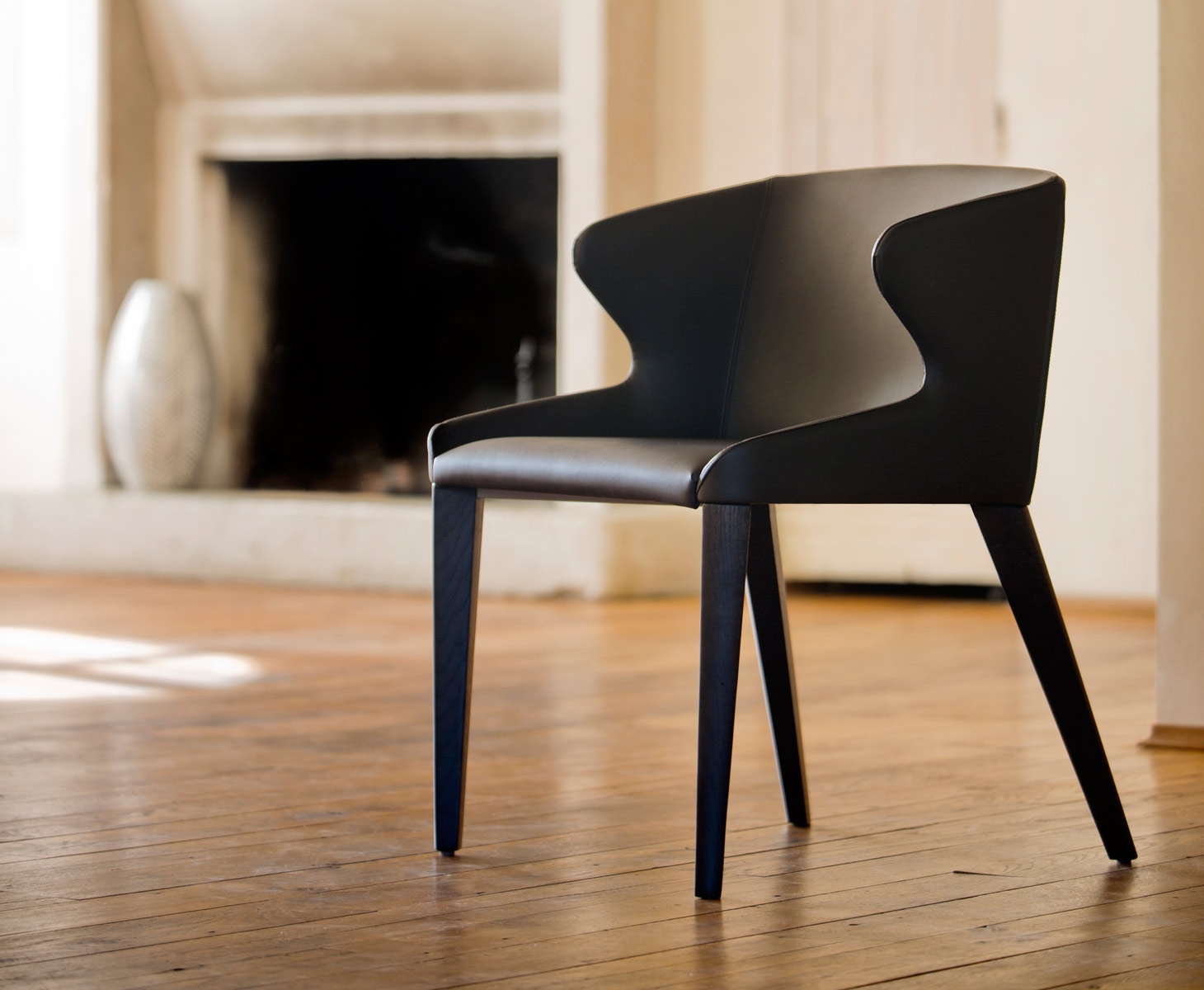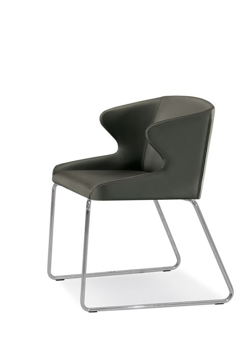 Poltroncina imbottita pensata per il ristorante, l’ufficio e la casa. Caratterizzata da angoli smussati e da un’immagine morbida e confortevole. Leila ha la scocca imbottita, rivestita in finta pelle. Telaio a slitta in tubo d’acciaio satinato Ø16 mm.