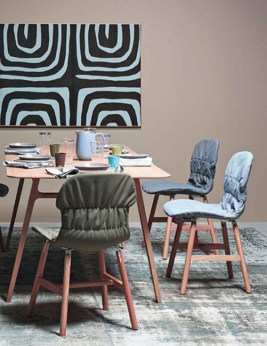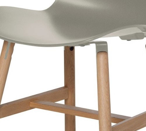La struttura in rovere naturale o tinto noce conferisce alla seduta un aspetto più caldo e confortevole rispetto a tutta la collezione. La scocca in polipropilene, è lucida nella parte posteriore e opaca nella parte anteriore. Può essere imbottita e rivestita sia parzialmente che totalmente. Per dare un aspetto più domestico e femminile alla sedia è stato pensato un rivestimento leggermente imbottito e sfoderabile.