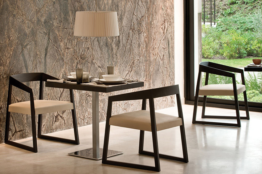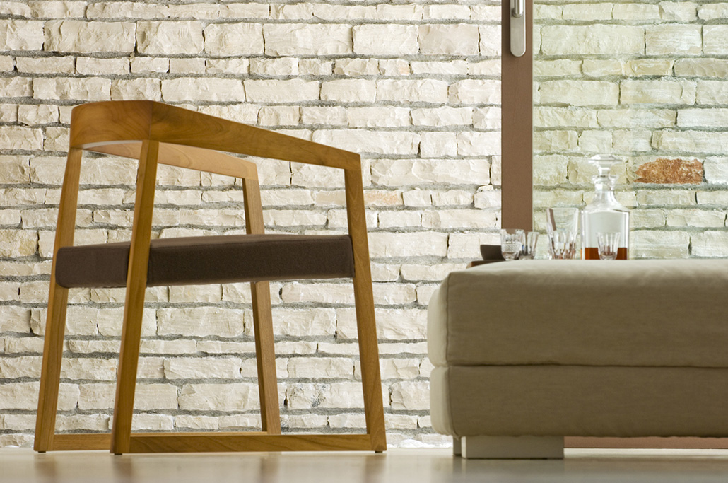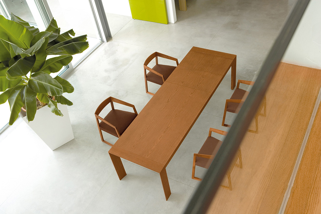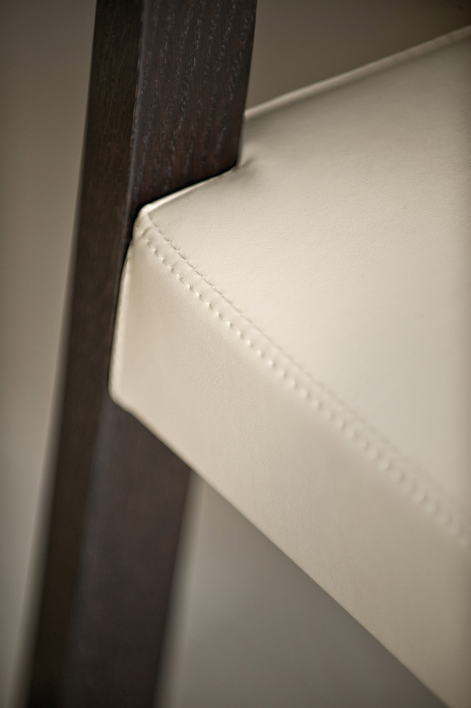 Poltroncina Sign realizzata in massello di noce canaletto o rovere con particolare sezione rastremata dei braccioli. Sedile imbottito rivestito in pelle o tessuto.