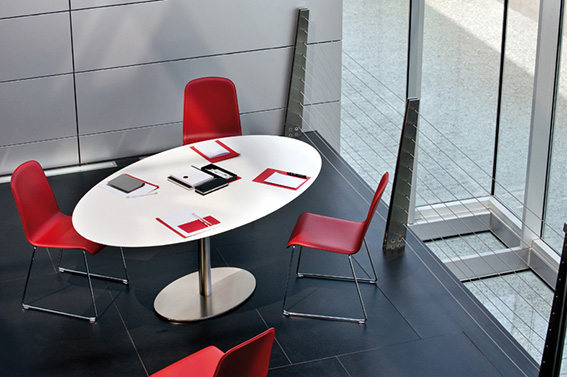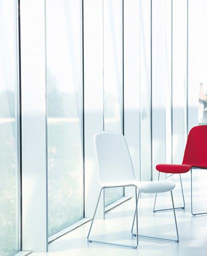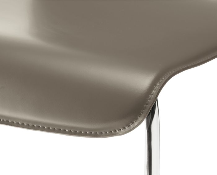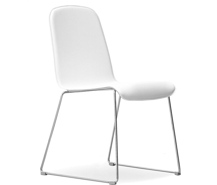 Coppia di sedie Trend con scocca rivestita in cuoio rigenerato, cuciture in tinta. Struttura in tondino d’acciaio cromato Ø10 mm.