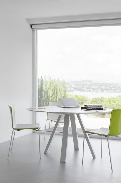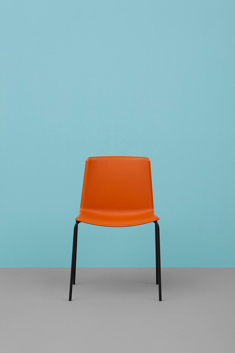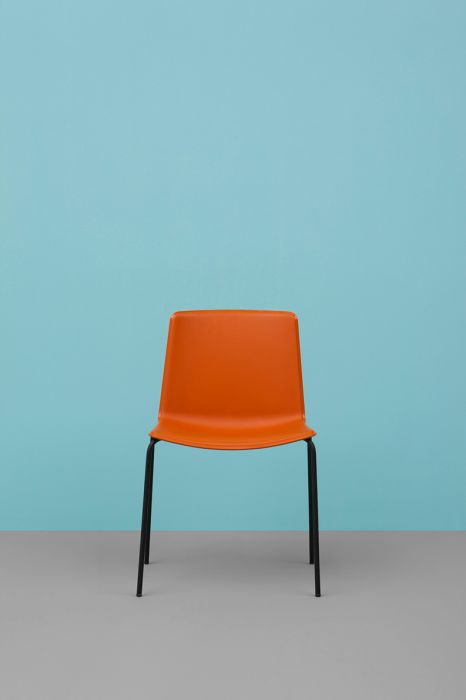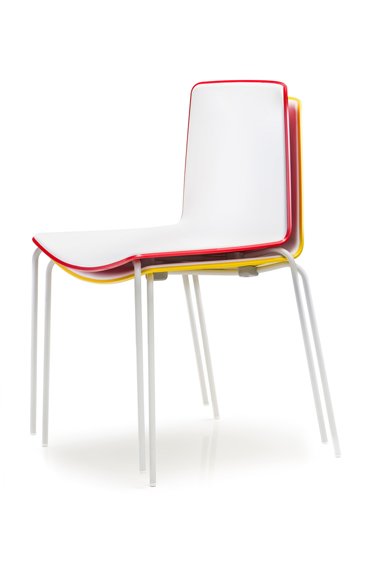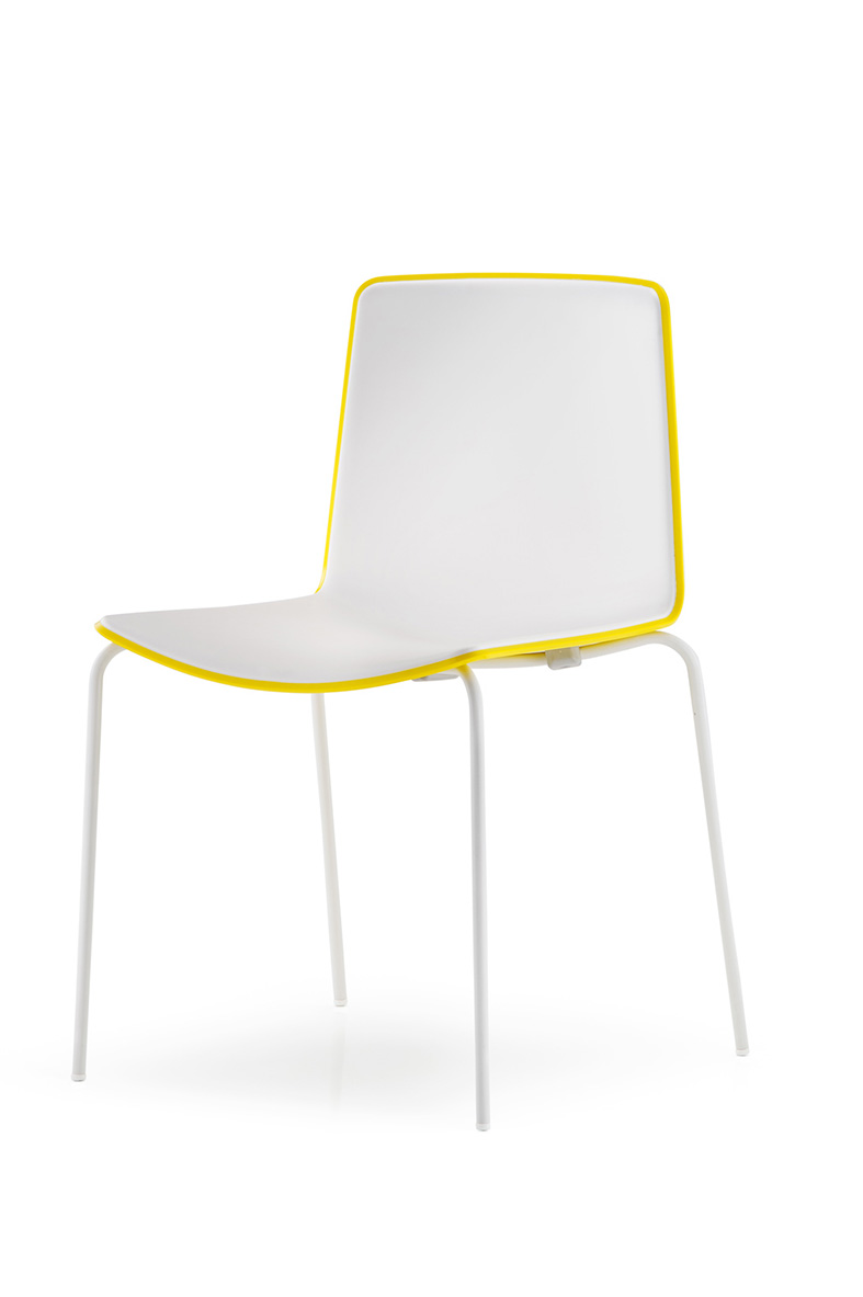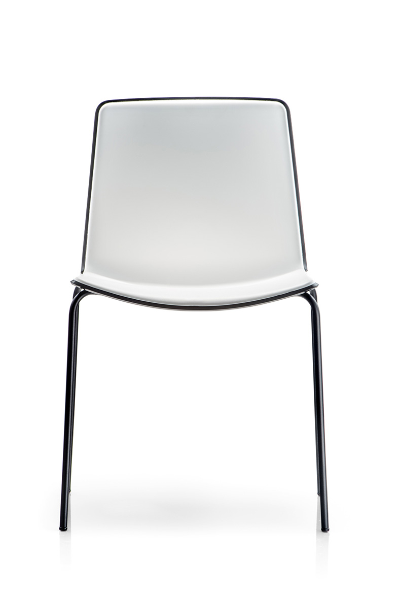 Set di quattro sedie Tweet. Dotate di scocca in polipropilene stampata a bi-iniezione con finitura opaca antigraffio per la parte frontale, finitura lucida per il retro, è possibile scegliere se avere la scocca monocolore o bicolore. Con struttura in acciaio Ø14 mm cromato, cromato nero o verniciato.