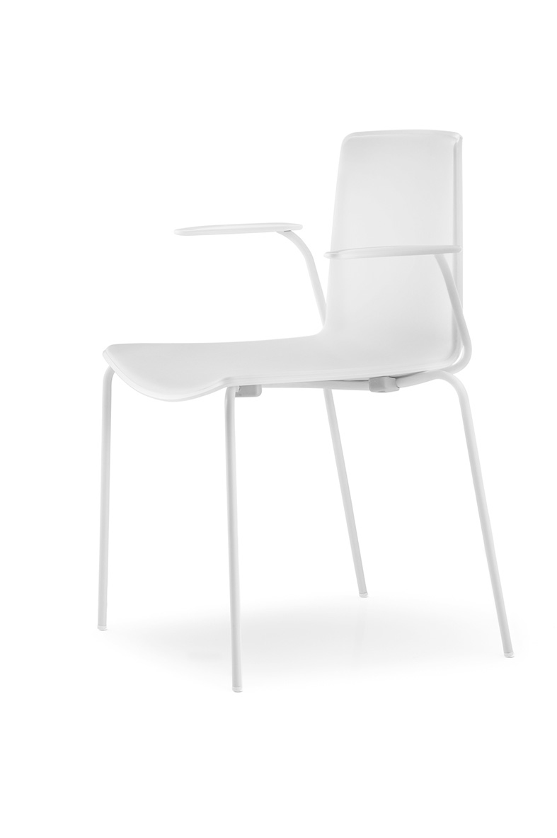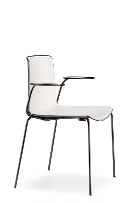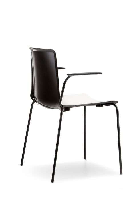 Set di quattro sedie Tweet. Dotate di scocca in polipropilene stampata a bi-iniezione con finitura opaca antigraffio per la parte frontale, finitura lucida per il retro, è possibile scegliere se avere la scocca monocolore o bicolore. Con struttura in acciaio Ø14 mm.