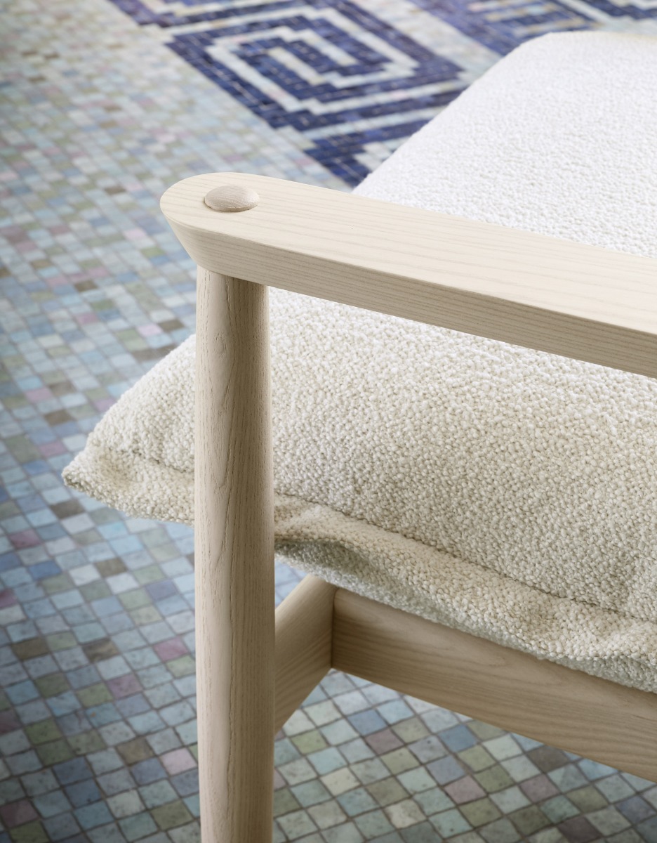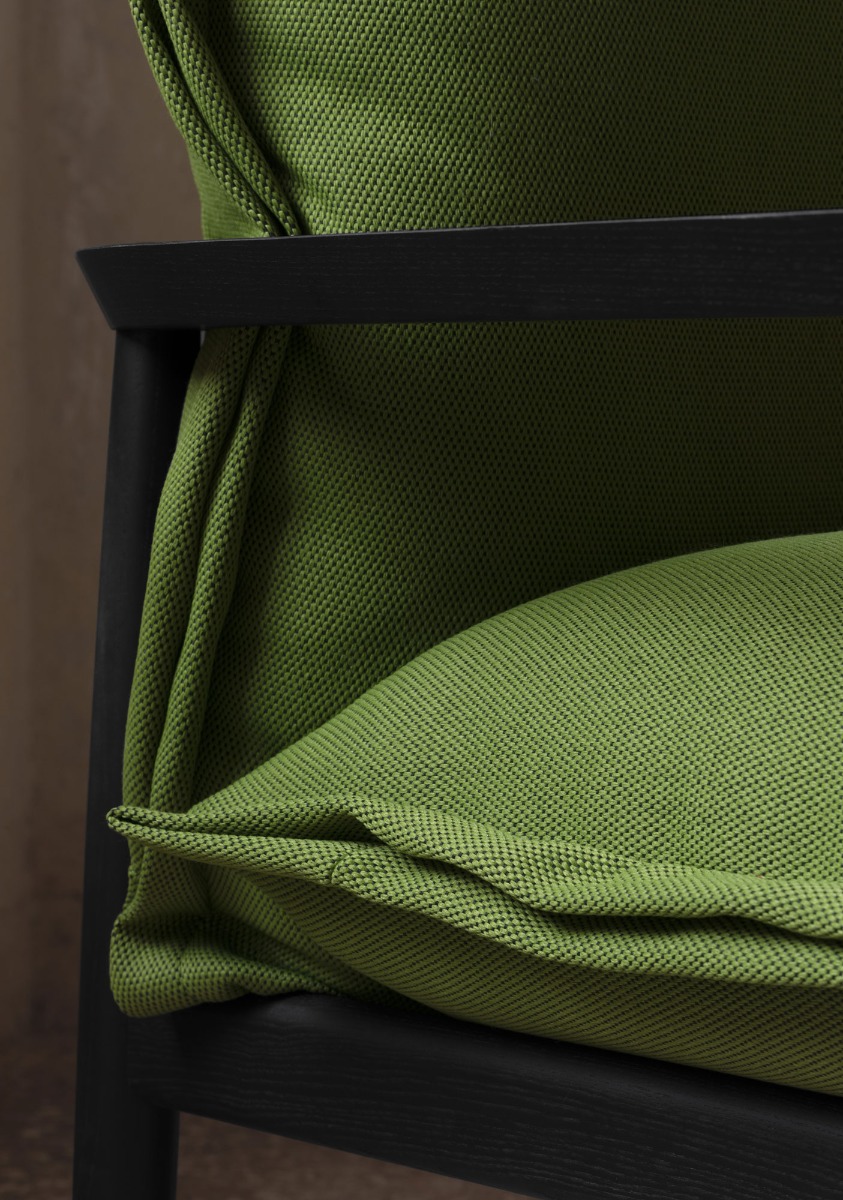 Poltrona con struttura in frassino, frassino tinto noce o frassino nero. I due cuscini, che compongono seduta e schienale, sono rivestiti nei tessuti elencati.
