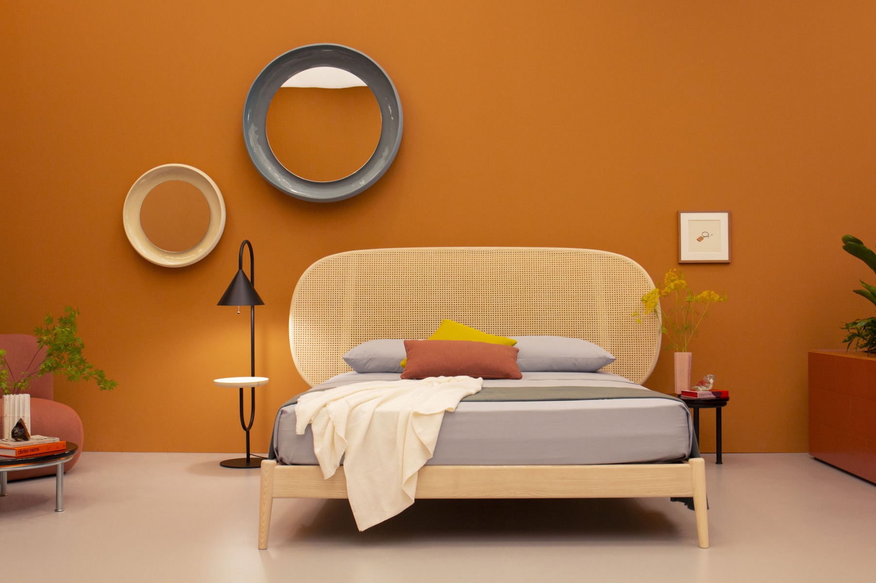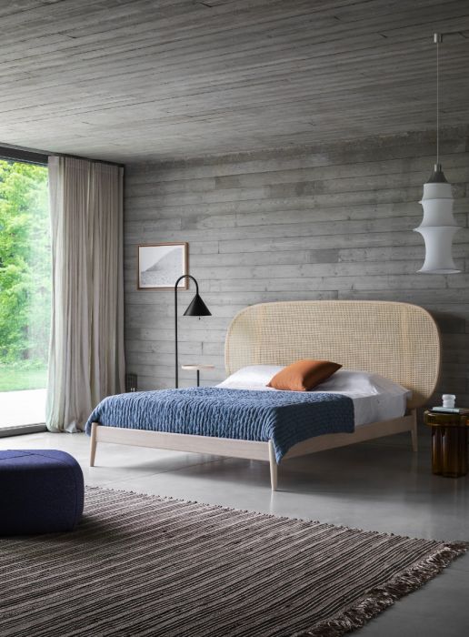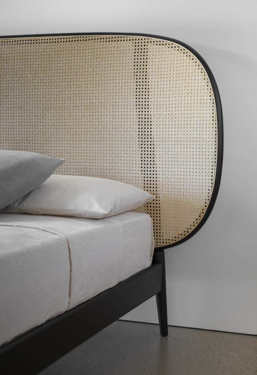 Letto con struttura in frassino e frassino nero. Lo schienale leggermente curvato accoglie la finitura in Paglia di Vienna, naturale o nera; la paglia di Vienna nera è disponibile solo con cornice nera.