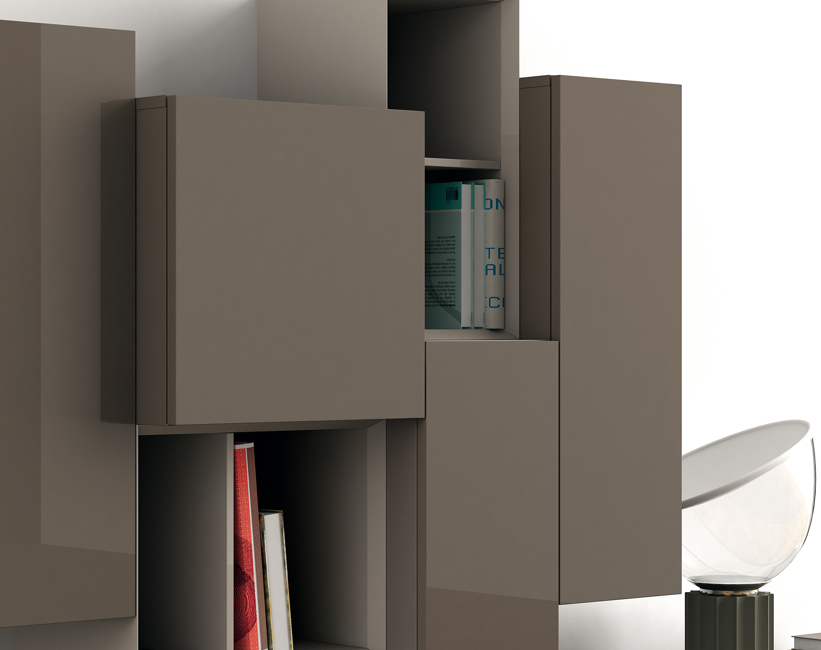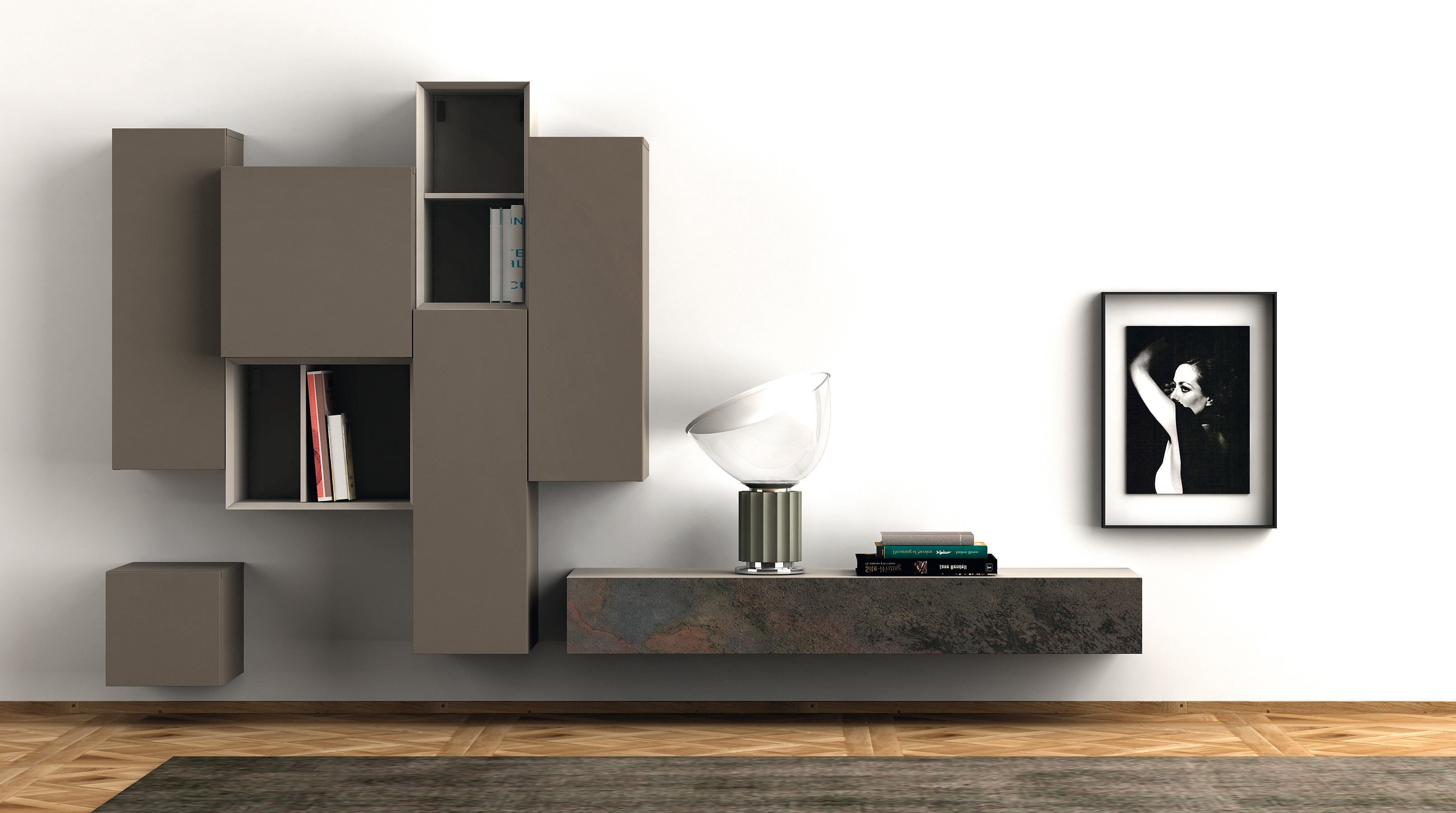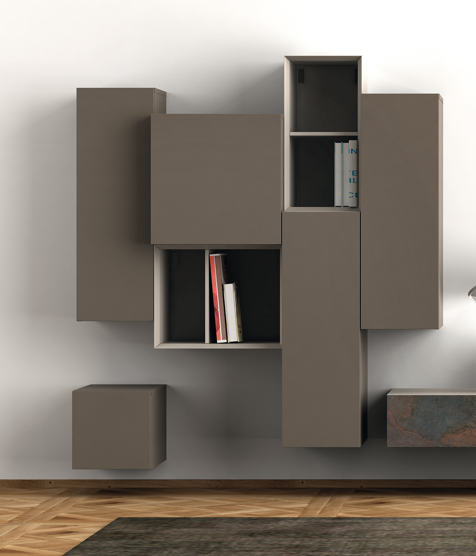 Composizione da L 270 x P 45 x H 170 cm con moduli con anta a ribalta con struttura in finitura laccato opaco argilla e frontale in finitura pietra multicolor. Moduli con anta battente in finitura laccato lucido spazzolato cappuccino. Moduli a giorno in finitura laccato opaco argilla.