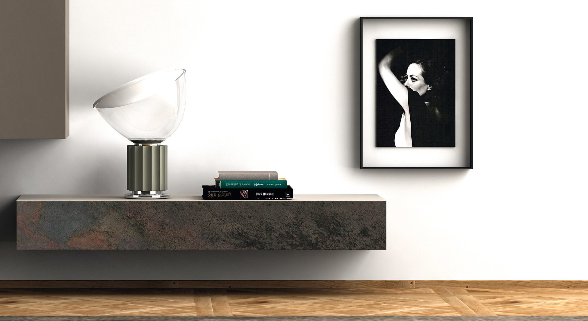 N°1 Modulo pensile con anta a ribalta (L 150 x P 45 x H 20 cm) con struttura in finitura laccato opaco argilla e frontale in finitura pietra multicolor