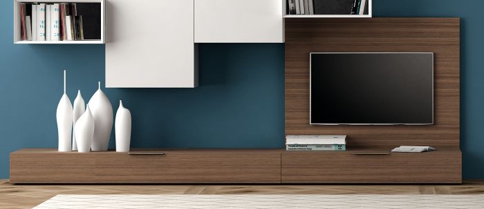 Composizione da L 300 x P 55 x H 201 cm con moduli a terra e boiserie in finitura noce canaletto con maniglia Y corta in finitura laccato opaco cioccolato. Moduli pensili con anta battente e a ribalta con struttura in finitura laccato opaco e frontale in finitura vetro lucido bianco. Moduli pensili a giorno in finitura laccato opaco bianco.