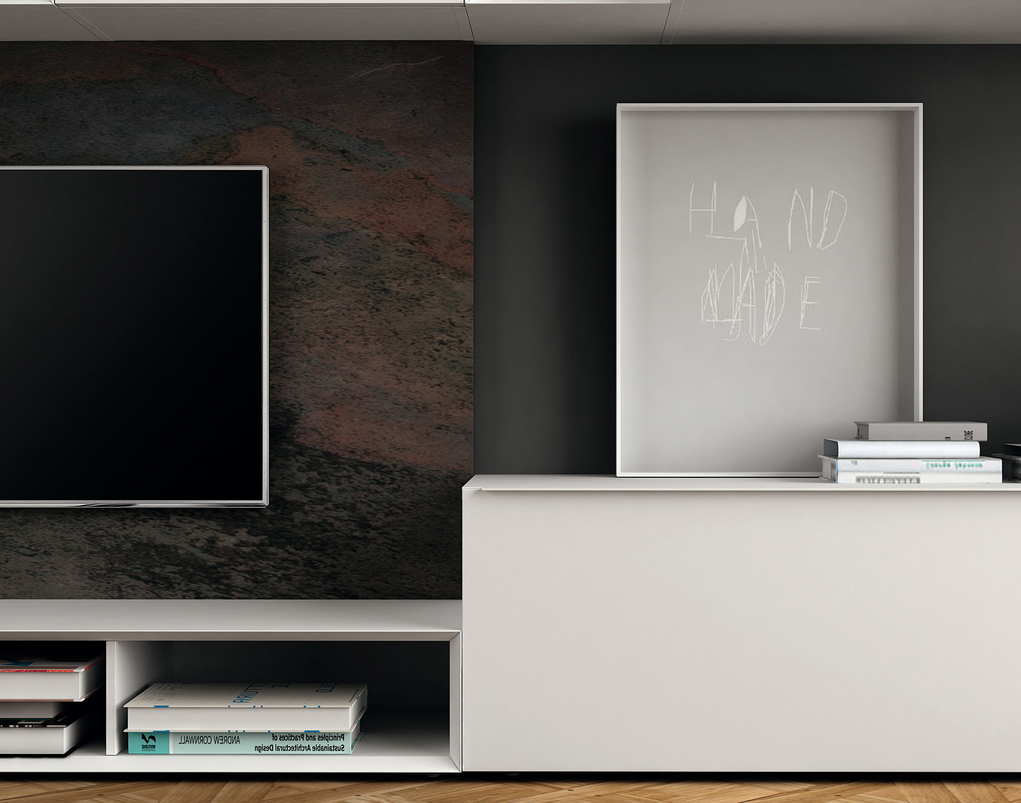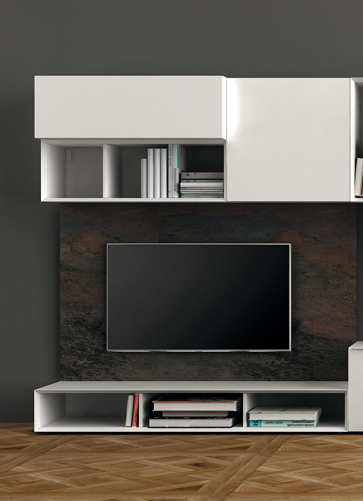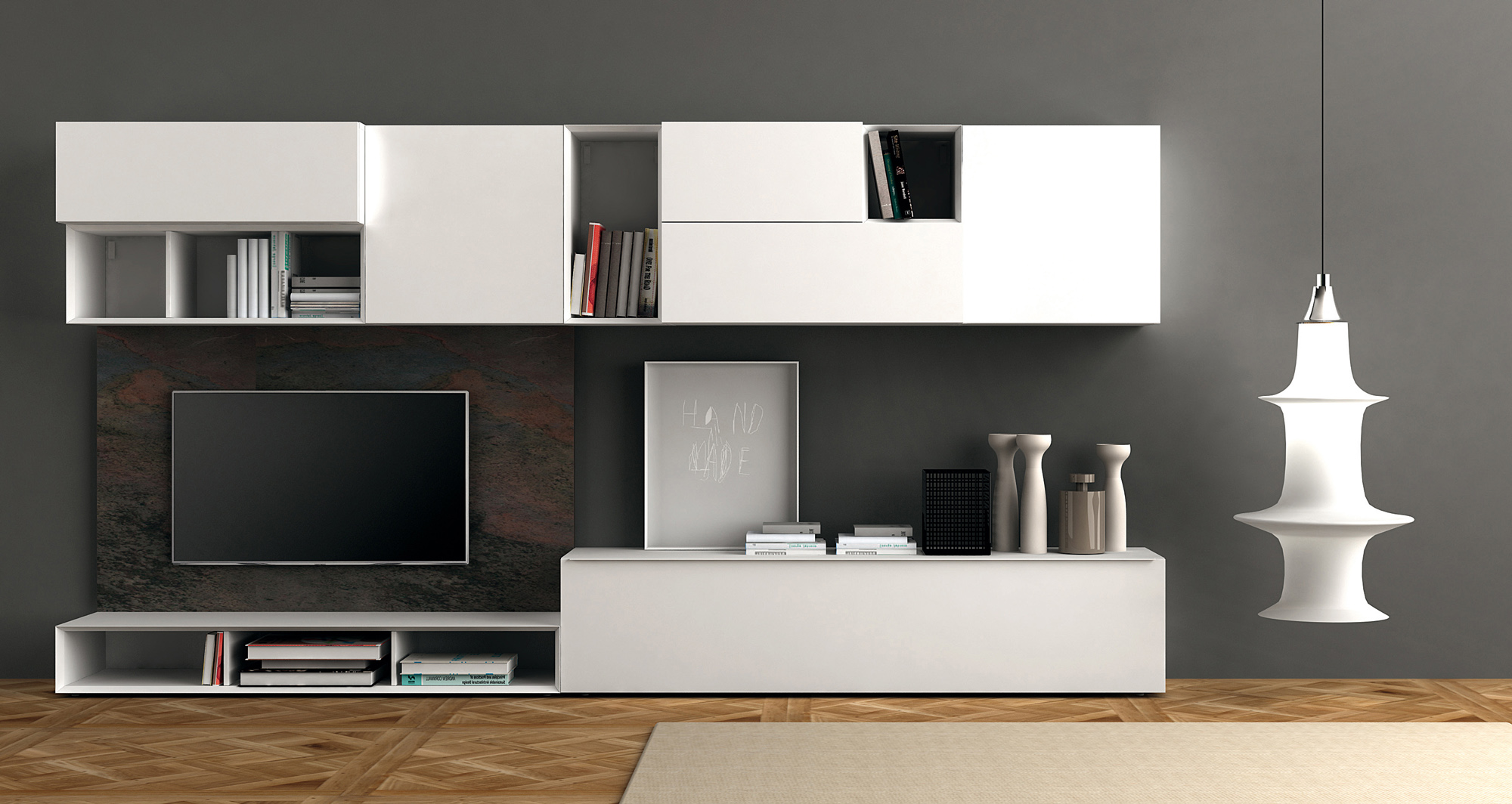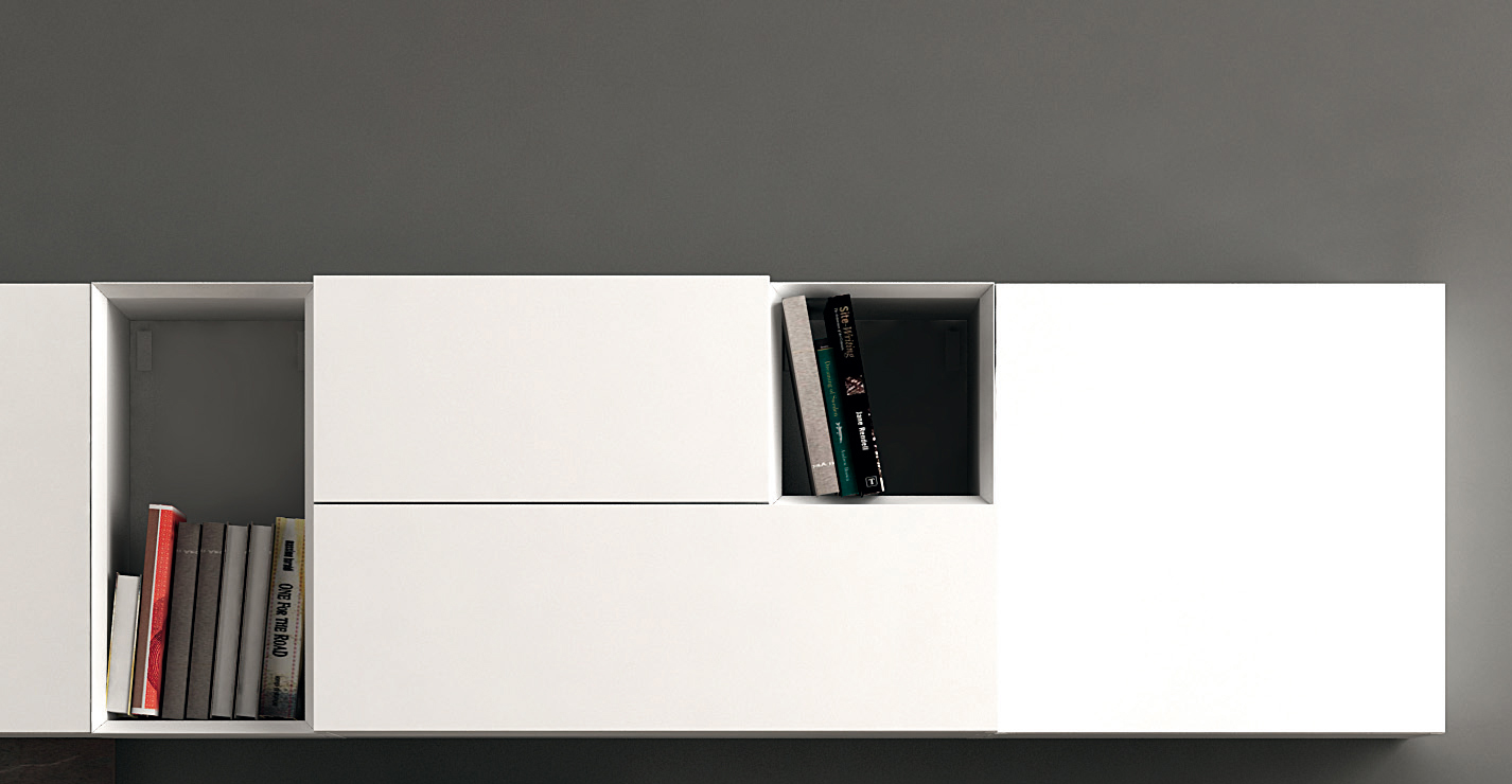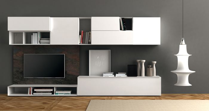 Composizione da L 330 x P 45 x H 171 cm con moduli con cassetto, con anta a ribalta, con anta battente e a giorno in finitura laccato opaco bianco, maniglia Y lunga in finitura laccato opaco bianco. Boiserie in finitura pietra multicolor.