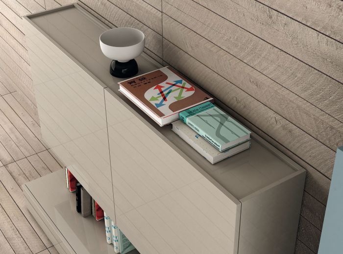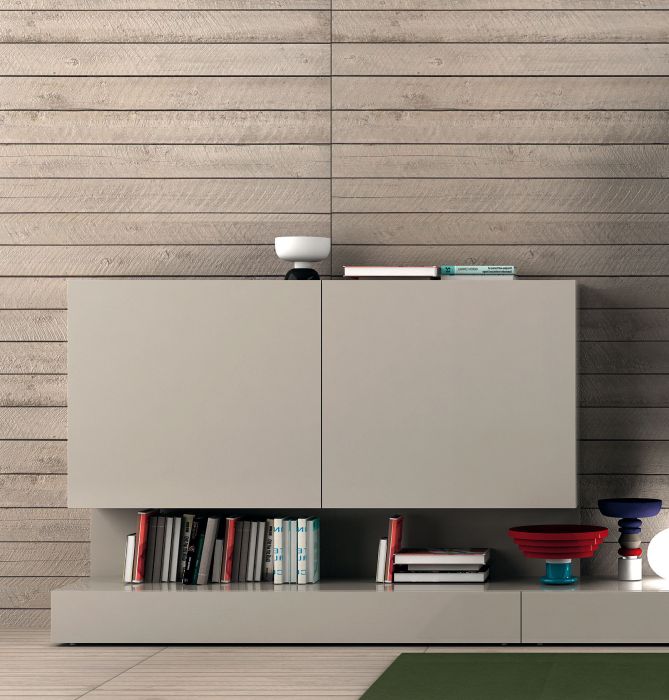 N°1 modulo a terra con anta a ribalta (L 180 x P 55 x H 21 cm) in finitura laccato lucido argilla