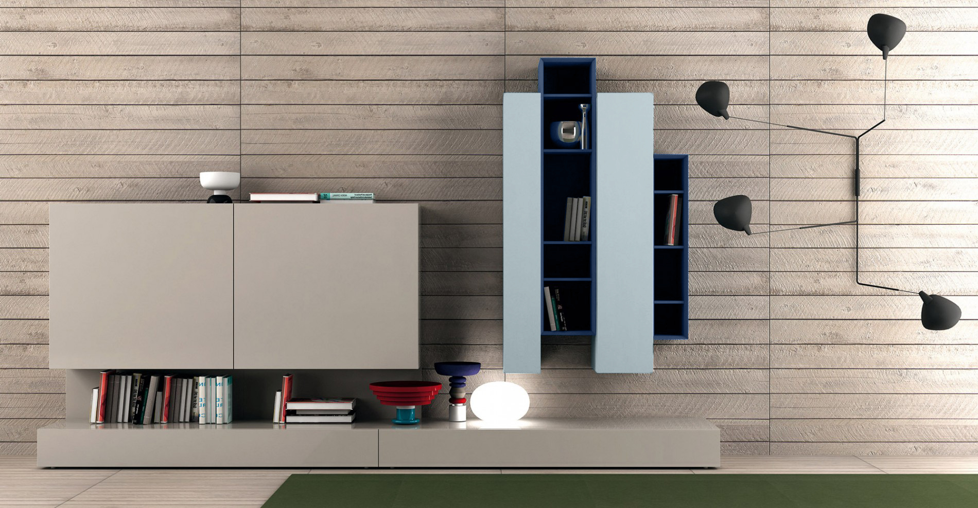 Composizione da L 360 x P 55 x H 220 cm con moduli a terra con cassetto e anta a ribalta, complanare e boiserie in finitura laccato lucido argilla. Moduli pensili con anta battente in finitura laccato opaco cielo. Moduli pensili a giorno in finitura laccato opaco notte.