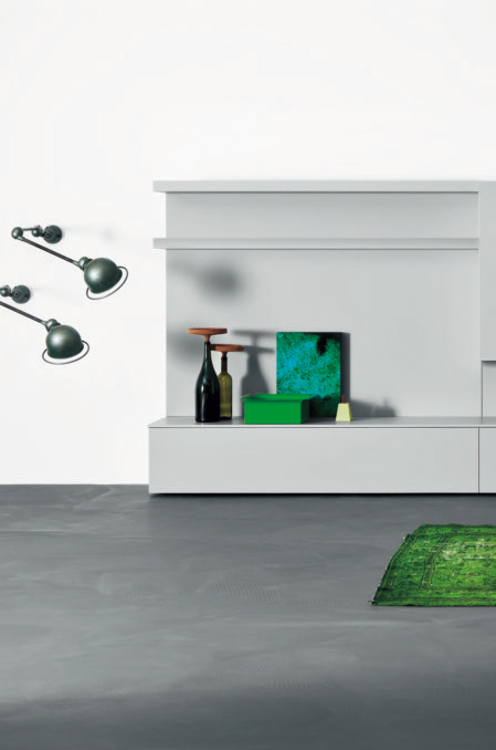 Composizione da L 350 x P 45 x H 152,4 cm con moduli a terra e pensili in finitura laccato opaco nuvola. Boiserie e mensole in finitura laccato opaco nuvola.