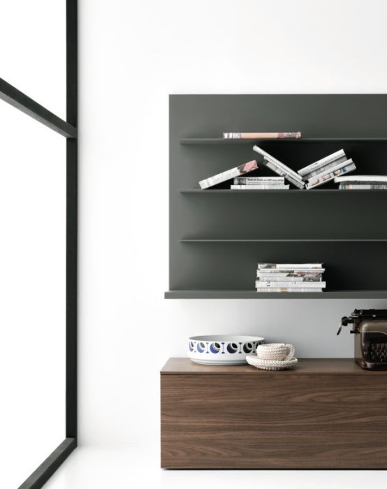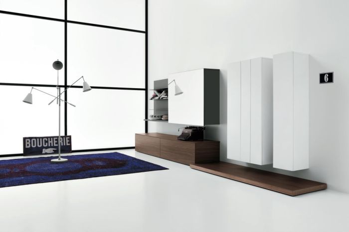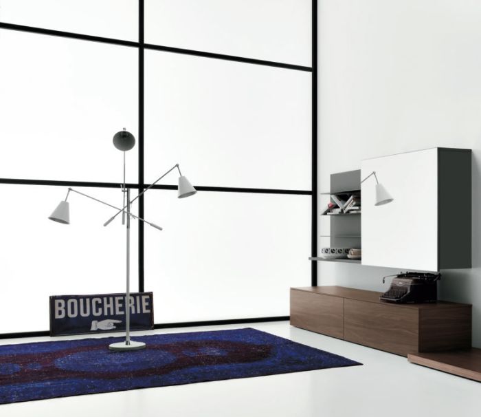 Composizione da L 440 x P 65 x H 170 cm con pedana, modulo a terra con cassetto e con anta a ribalta in finitura noce canaletto. Moduli pensili con anta battente in finitura laccato opaco bianco. Modulo pensile Vision (anta scorrevole) con struttura in finitura laccato opaco grigio scuro ed anta in finitura specchio fumè