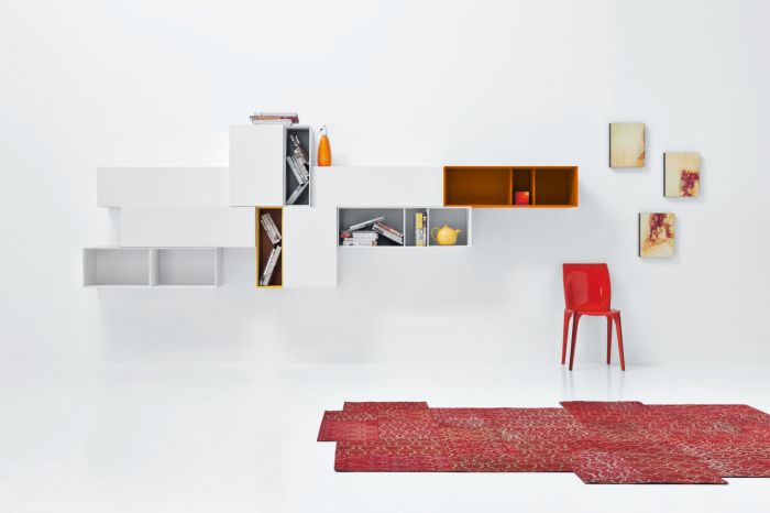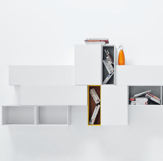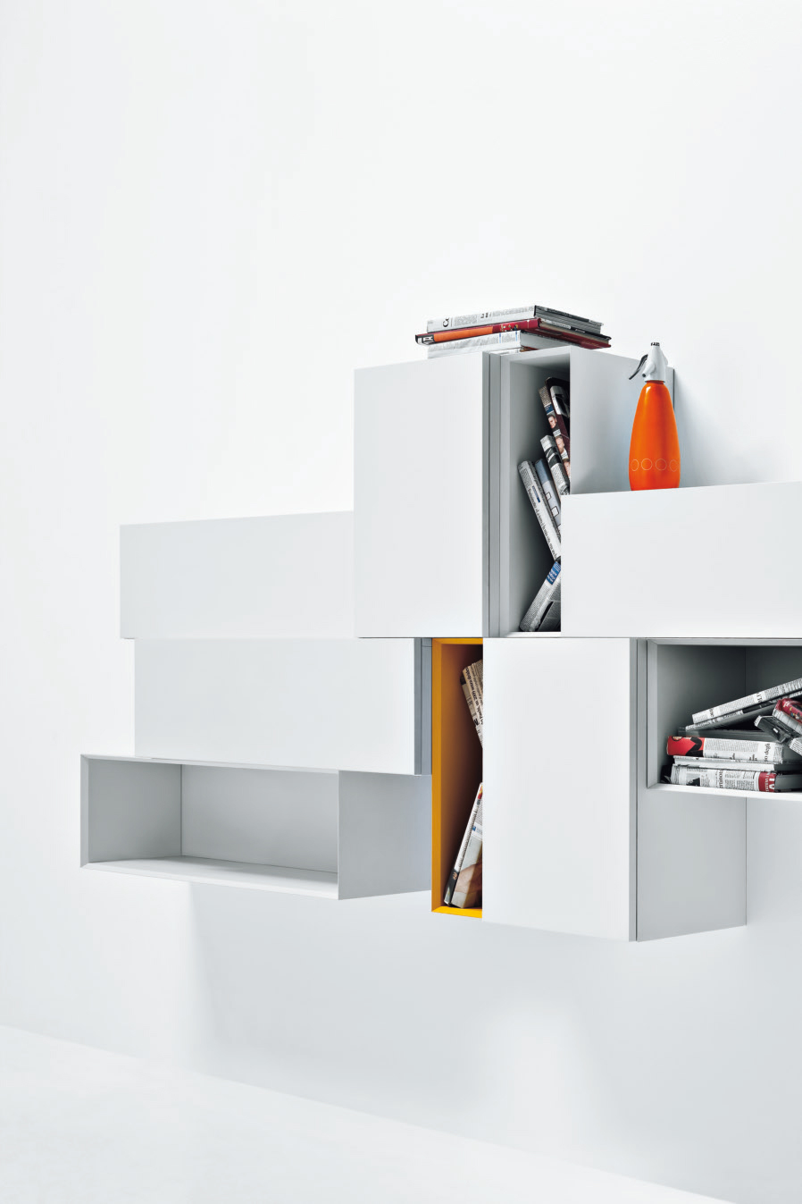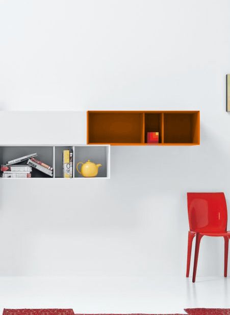Composizione da L 370 x P 45 x H 180 cm con moduli pensili con anta a ribalta e anta battente in finitura laccato opaco bianco. Moduli pensili a giorno in finitura laccato opaco bianco, laccato opaco zafferano e laccato opaco tucano