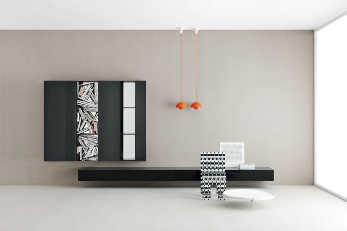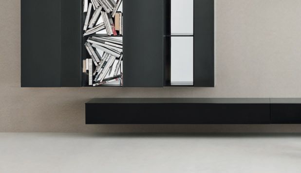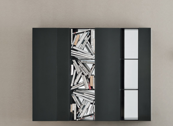 Composizione da L 400 x P 45 x H 210 cm con moduli pensili con cassetto e con anta a ribalta in finitura laccato opaco lavagna. Moduli pensili con anta battente in finitura laccato lucido lavagna. Moduli pensili a giorno in finitura laccato opaco lavagna con schienalini in finitura specchio