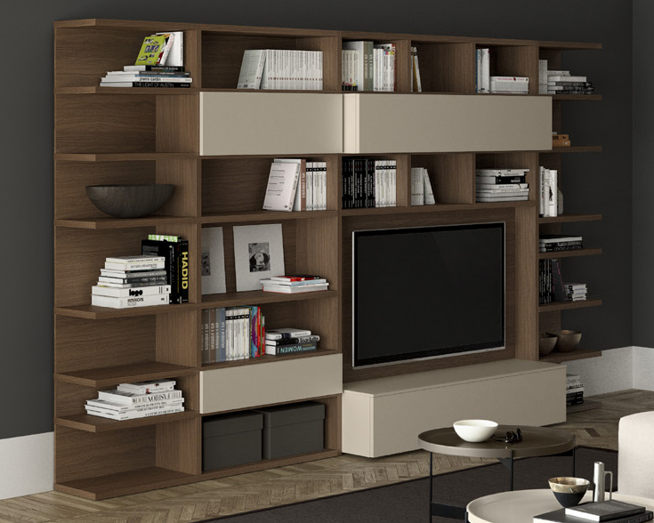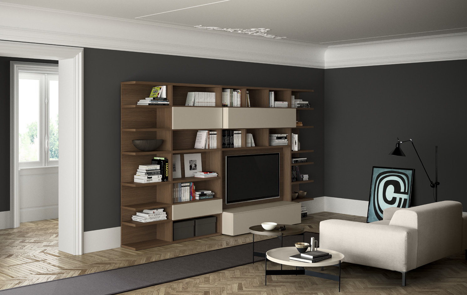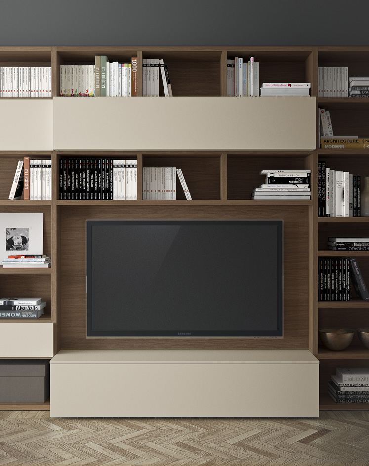 Composizione da L 360 x P 35/55 x H 214 cm con vano TV con moduli a cassetto/ribalta e vani a giorno. Struttura in finitura essenza noce canaletto, moduli a cassetto e ad anta a ribalta in finitura laccato opaco tortora.