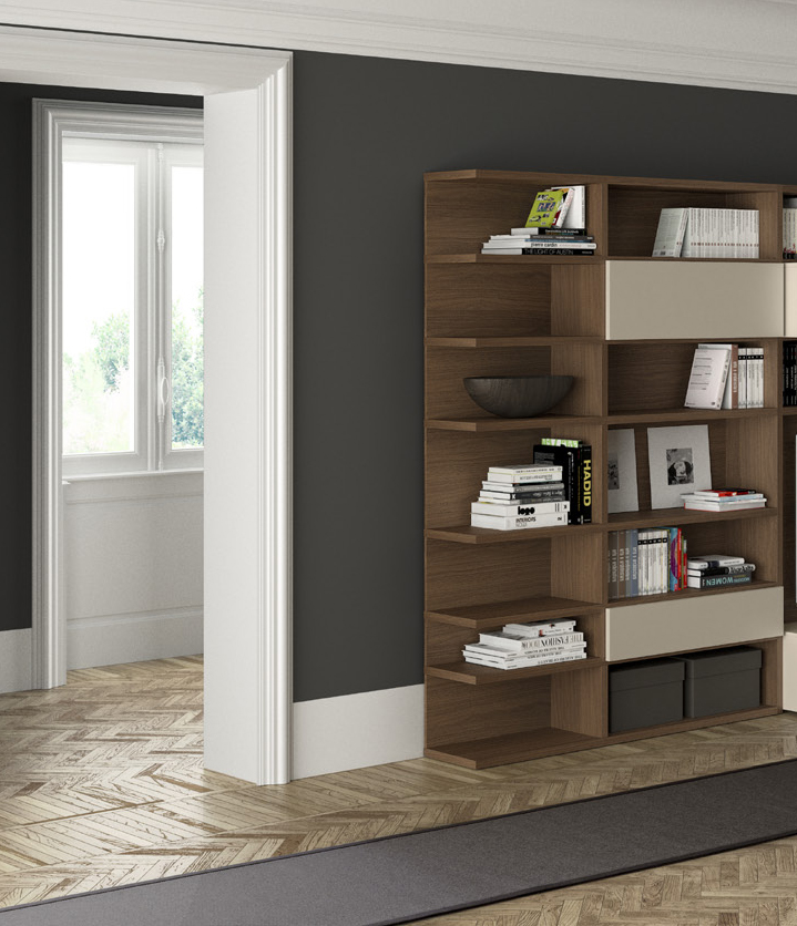 N°1 modulo colonna c/schienale TV (L 150 x P 55 x H 214 cm) in finitura noce canaletto e moduli a cassetto e ad anta a ribalta in finitura laccato opaco tortora