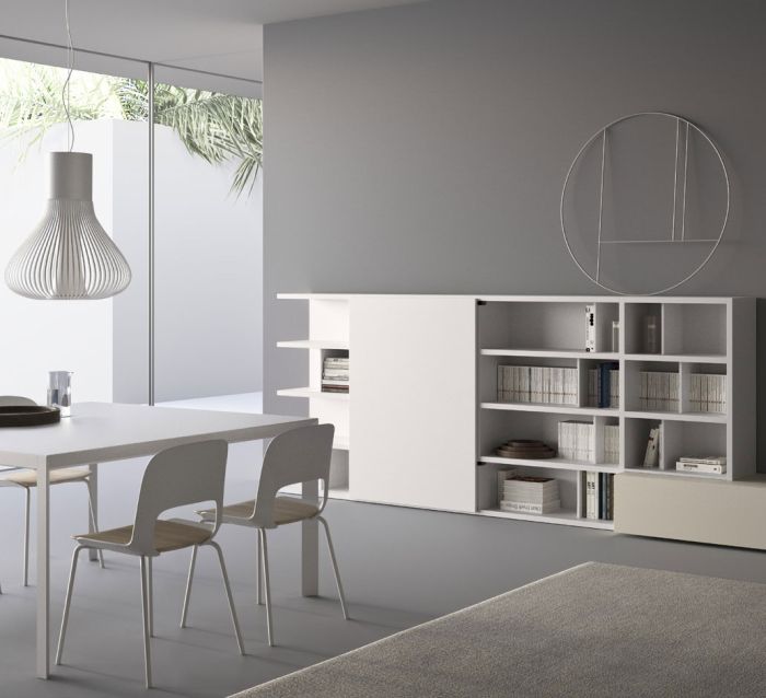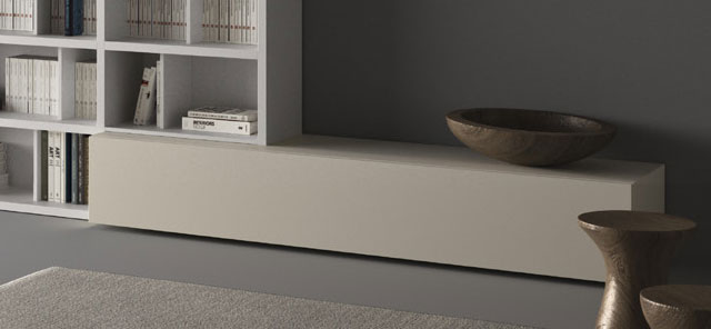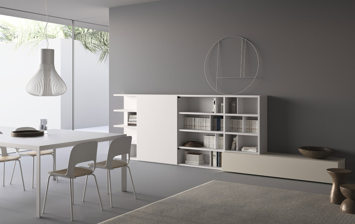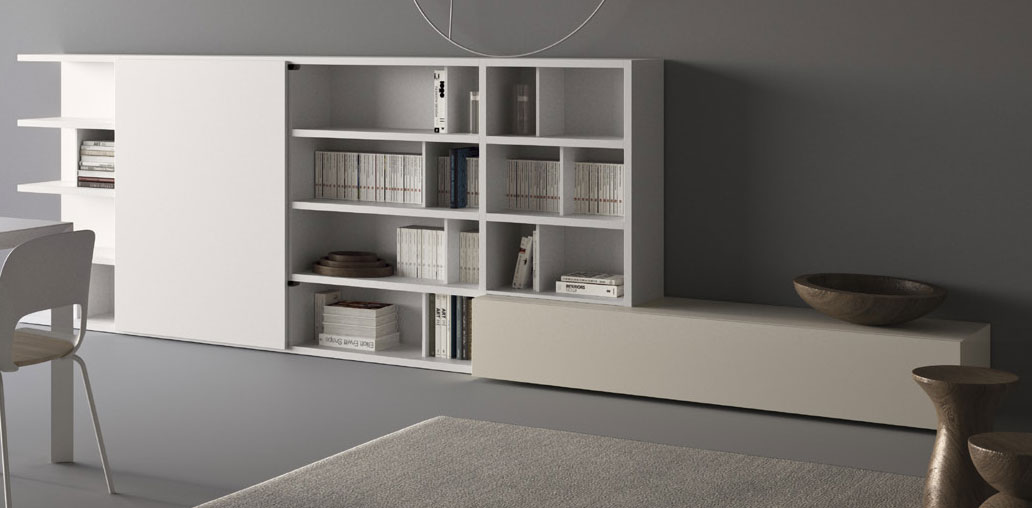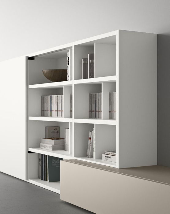 Composizione da L 420 x P 36/45 x H 124 cm con vani a giorno, anta scorrevole e moduli cassetto. Struttura, vani a giorno e anta scorrevole in finitura laccato opaco bianco, modulo cassetto in finitura laccato opaco tortora.