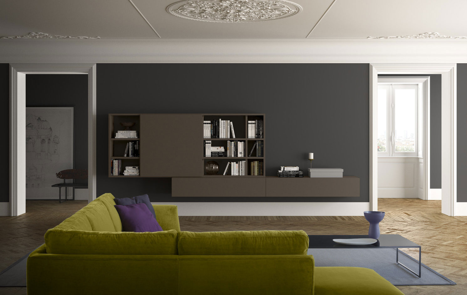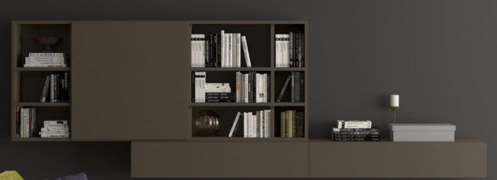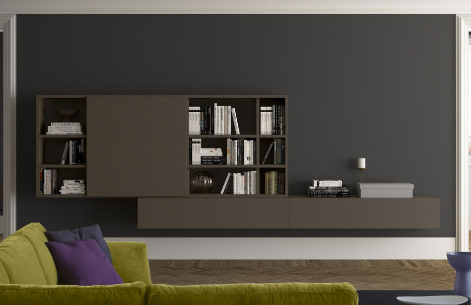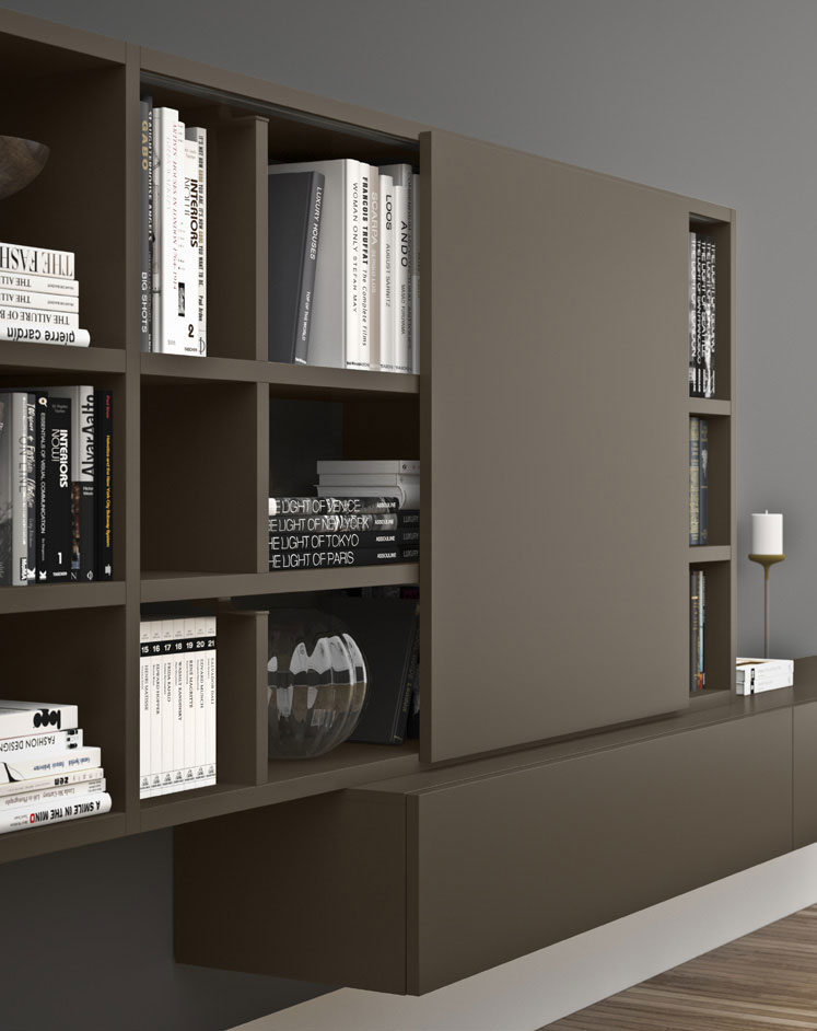 Composizione da L 403 x P 36/45 x H 133 cm con vani a giorno, ante a ribalta e anta scorrevole. Struttura e ante in finitura laccato opaco cappuccino.