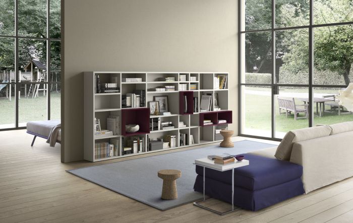 Composizione da L 382 x P 33/45 x H 164 cm con vani a giorno. Struttura in finitura laccato opaco nuvola, moduli vani a giorno in finitura laccato opaco melanzana.