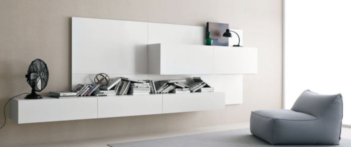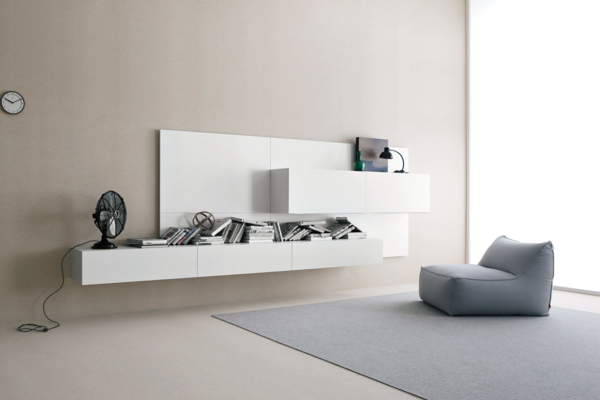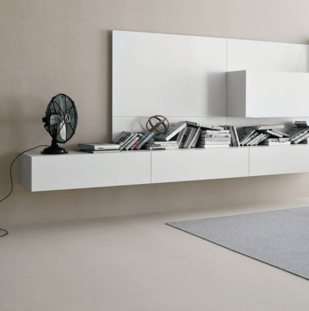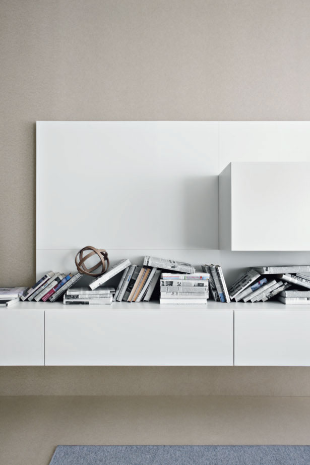 Composizione da L 400 x P 45 x H 150 cm con moduli cassetto, ante a ribalta e basculanti in finitura laccato opaco bianco. Boiserie in finitura laccato opaco bianco.
