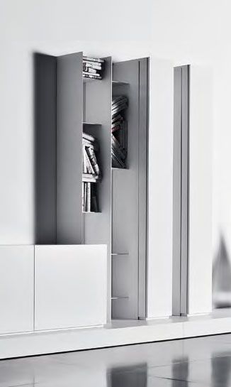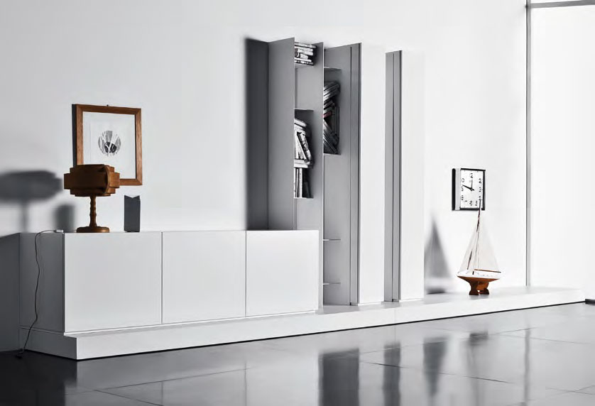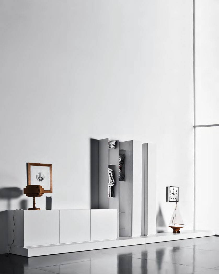 Composizione da L 457 x P 28/65 x H 211 cm con pedana in laccato opaco bianco, moduli anta in appoggio e appesi in laccato lucido bianco, moduli a giorno appesi verniciati bianco opaco.