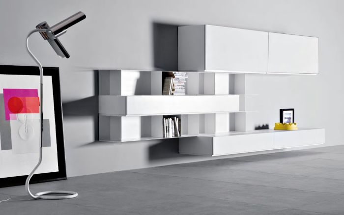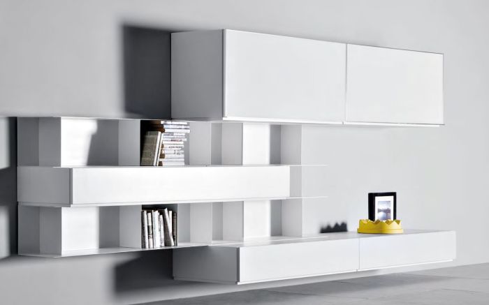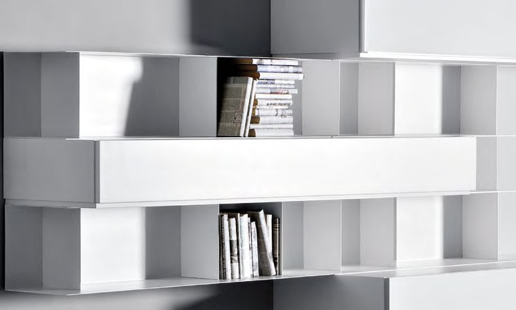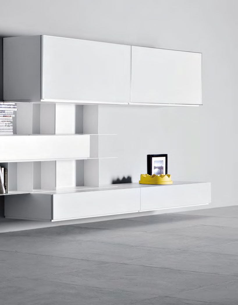 Composizione da L 392 x P 28/42 x H 175 cm con moduli a cassetto e moduli con anta a ribalta in finitura laccato lucido bianco, moduli basculanti in finitura laccato lucido bianco con ante in vetro lucido bianco e telaio brill, moduli a giorno verniciati in finitura bianco opaco.