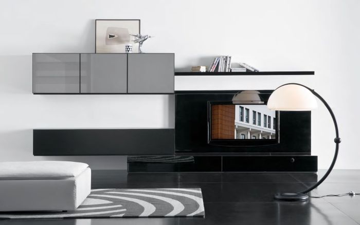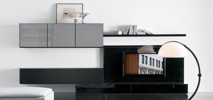N°1 modulo a terra con anta a ribalta (L 261 x P 52 x H 25 cm) in finitura laccato lucido nero