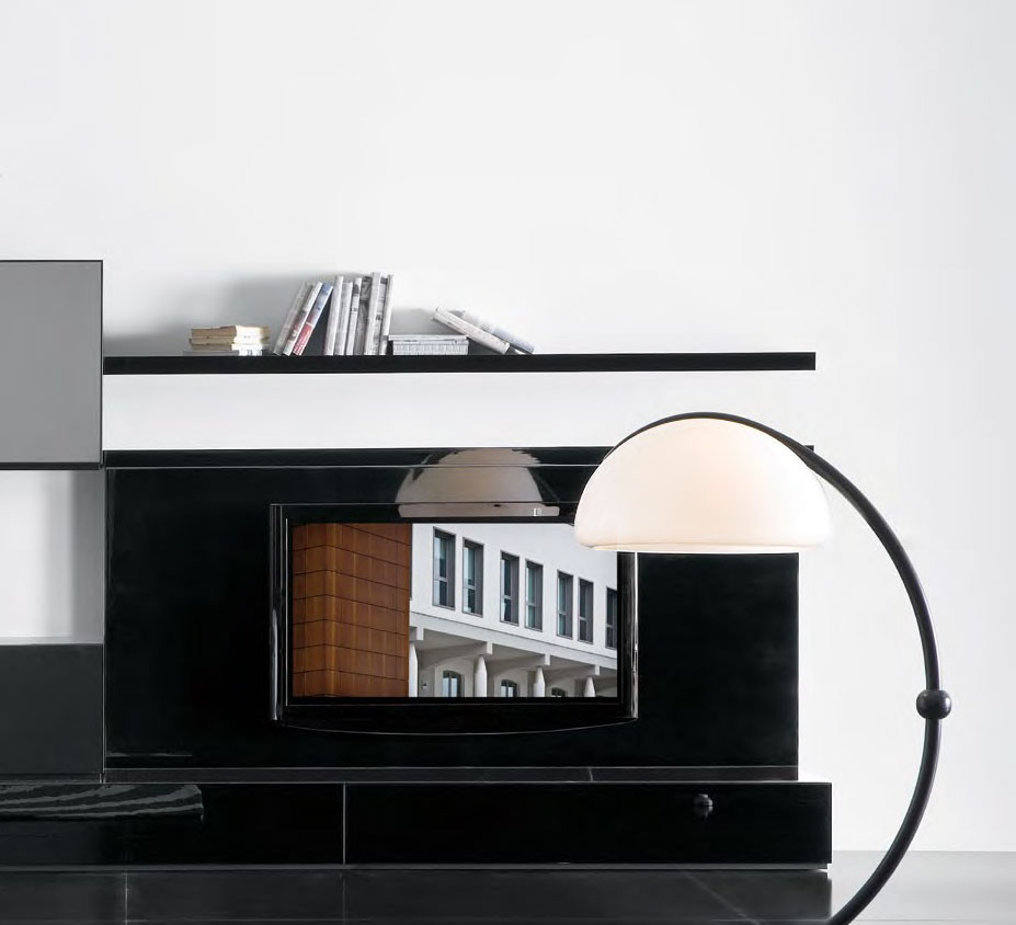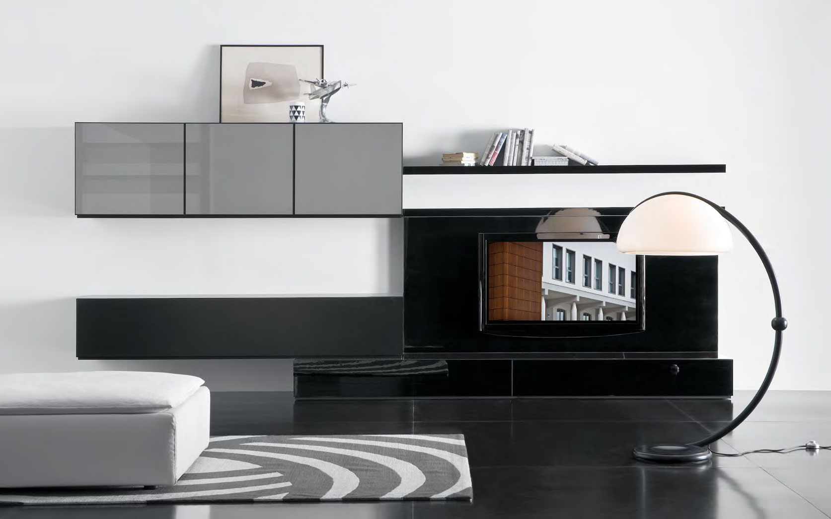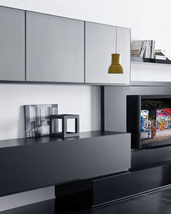 Composizione ad angolo da L 392 x P 28/52 x H 170 cm con modulo a terra con anta a ribalta in finitura laccato lucido nero, modulo pensile con cassettone in finitura laccato opaco nero, modulo pensile con ante battenti in finitura laccato opaco nero con frontale in vetro stop-sol e telaio brunito, boiserie e mensole in finitura laccato lucido nero.