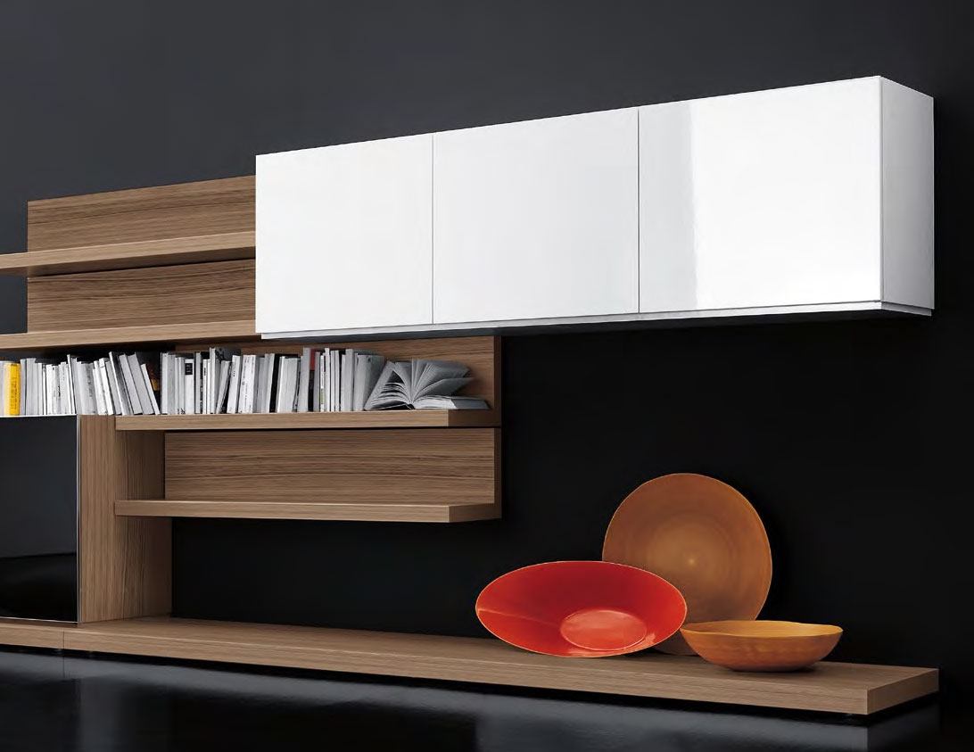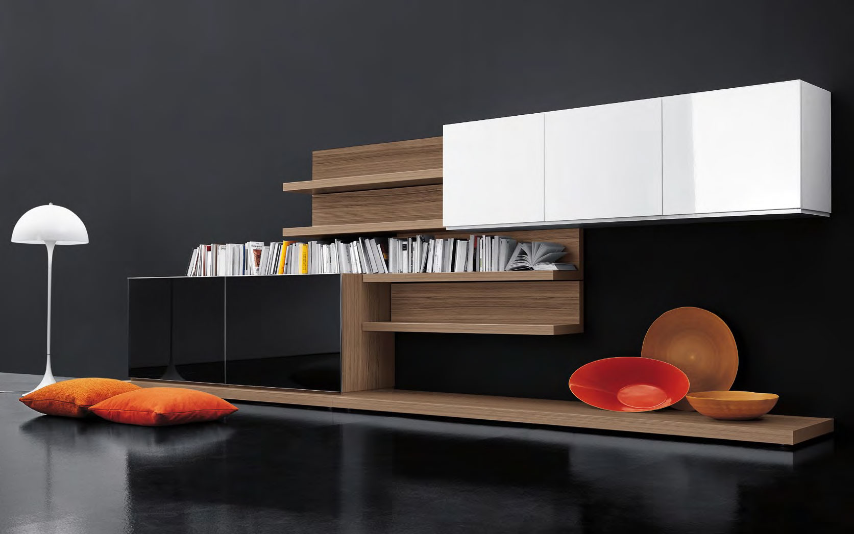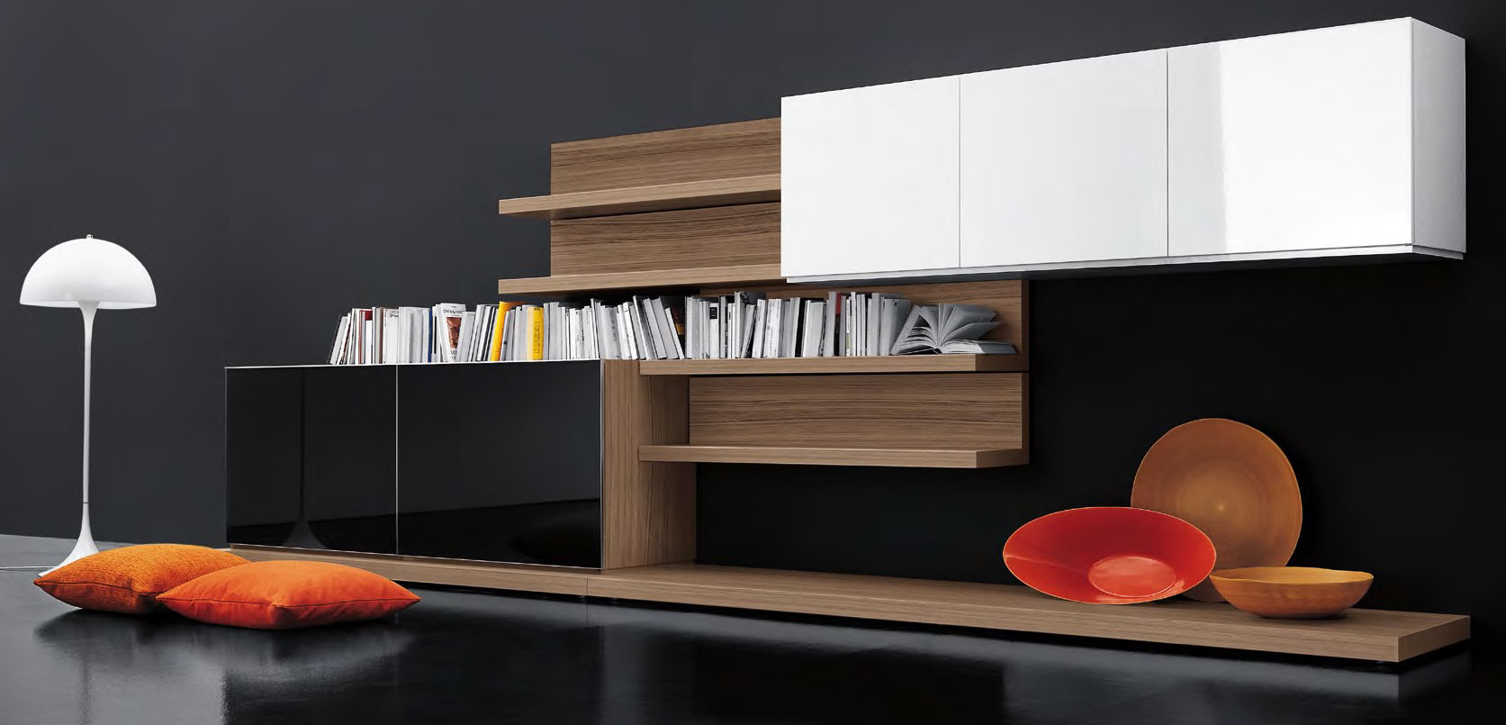 Composizione L 457 x P 34/65 x H 160 cm con pedane in finitura noce canaletto, modulo con ante complanari in appoggio in finitura noce canaletto con frontale in finitura vetro lucido nero e telaio brill, modulo pensile con ante battenti in finitura laccato lucido bianco, boiserie e mensole in finitura noce canaletto.