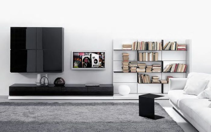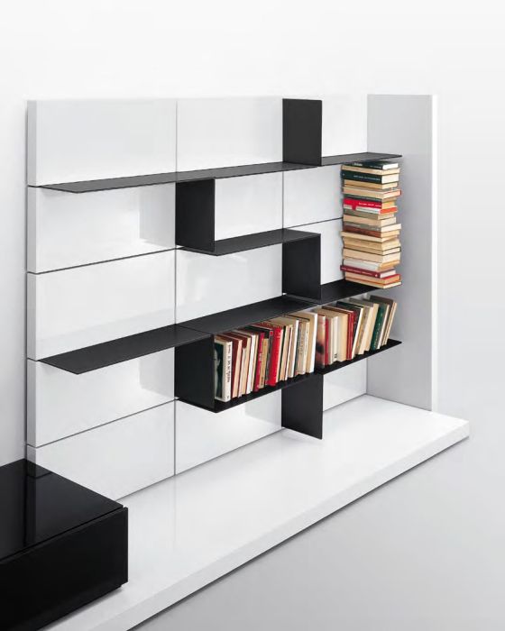Composizione L 463 x P 26/65 x H 175 cm con moduli a pedane, fianco e boiserie in finitura laccato lucido bianco, modulo a ribalta in appoggio e moduli anta appesi in finitura laccato lucido nero, mensole in finitura laccato opaco nero.