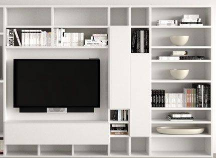 Composizione da L 469 x P 35/45 x H 224 cm con vano Tv, vani a giorno e ante battenti, a ribalta o a cassetto. Struttura e ante in finitura laccato opaco bianco.
