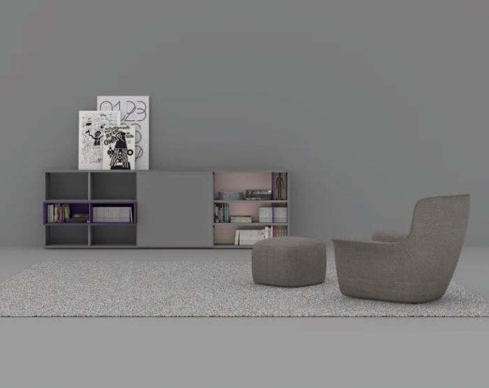 Struttura e anta scorrevole in finitura laccato opaco piombo e ninfea, modulo a giorno inserito e dettagli in laccato opaco melanzana.