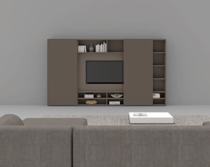 Composizione da L 363 x P 36 x H 204 cm con vano porta TV e ante scorrevoli in legno.