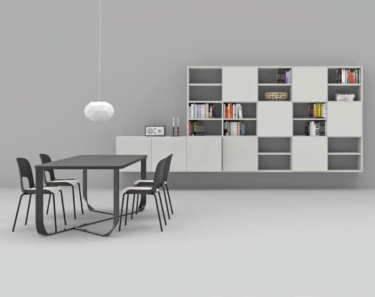 Composizione da L 423 x P 45 x H 183 cm con e moduli battenti e vani a giorno. Finitura laccato opaco perla.
