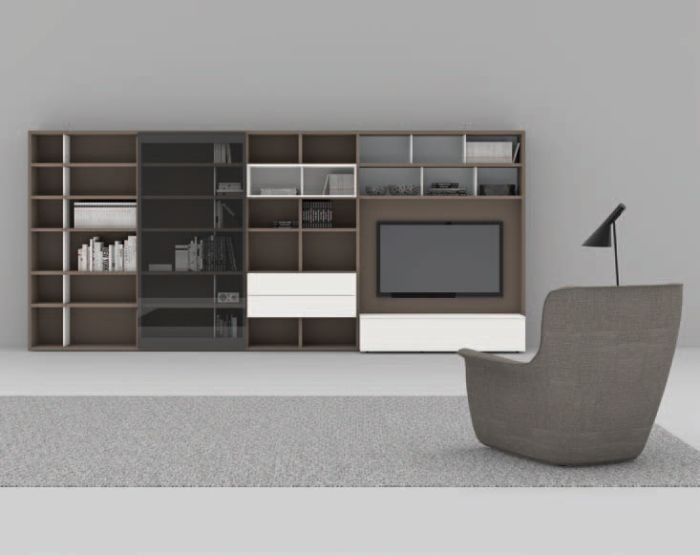 Composizione da L 459 x P 55 x H 204 cm con anta scorrevole in vetro, moduli a giorno, moduli cassetto, schienale porta TV e modulo ribalta.