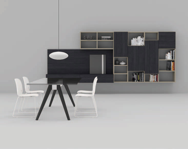 Composizione da L 463 x P 45 x H 183 cm con moduli a giorno, moduli battenti, boiserie e ante ribalta. Finitura laccato argilla e rovere grigio.