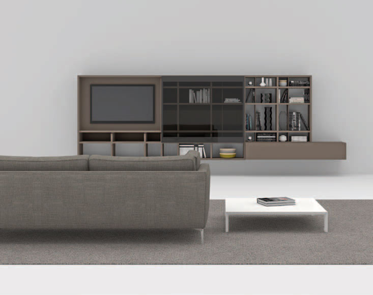 Composizione da L 483 x P 45 x H 153 cm con vani a giorno, schienale TV, anta scorrevole in vetro e modulo ribalta. Finitura laccato cappuccino.