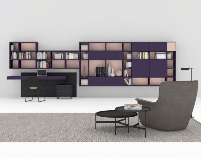 Composizione da L 573 x P 66 x H 153 cm con vani a giorno, ante battenti, ante ribalta, cassetti e modulo pensile. Finitura laccato opaco melanzana e laccato opaco ninfea.