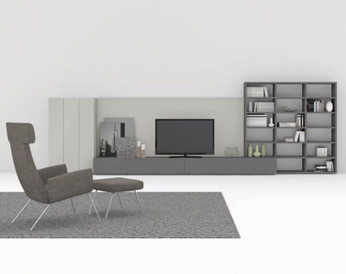Composizione da L 593 x P 55 x H 184 cm con vani a giorno, ante battenti, cassetti e boiserie. Finitura laccato opaco piombo e laccato opaco nuvola.