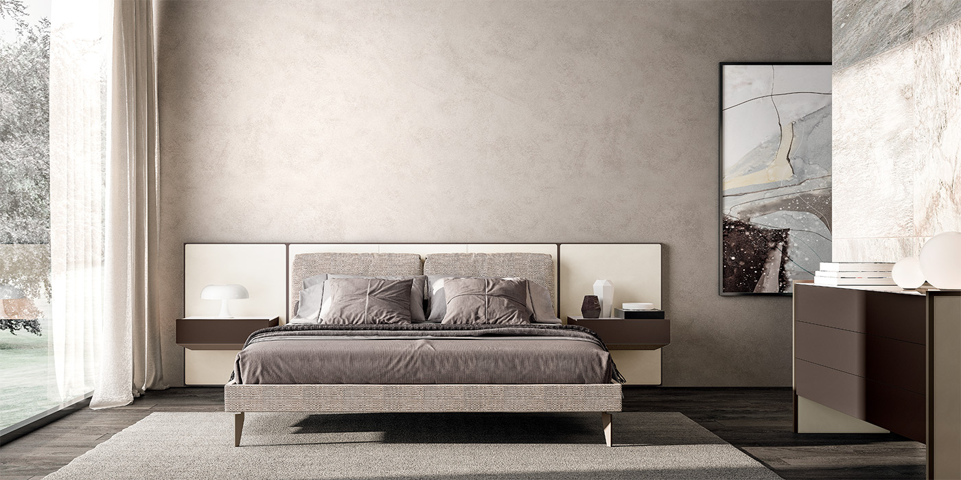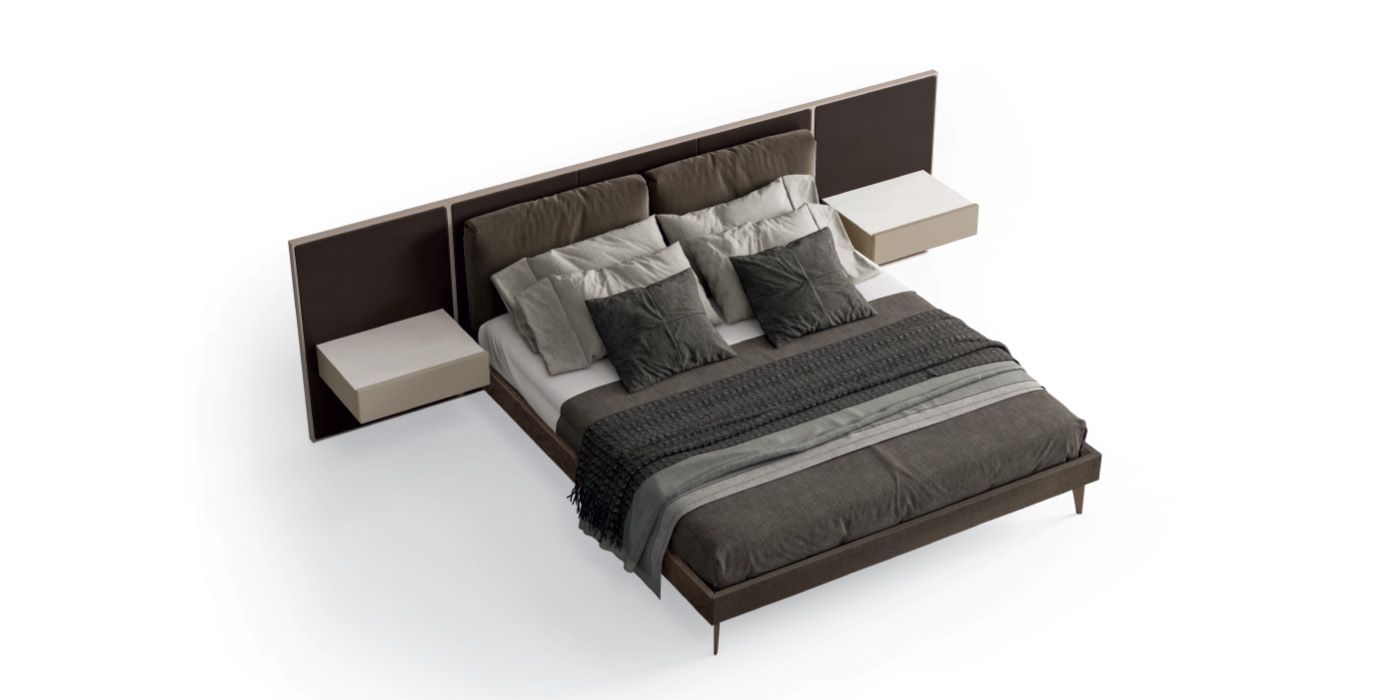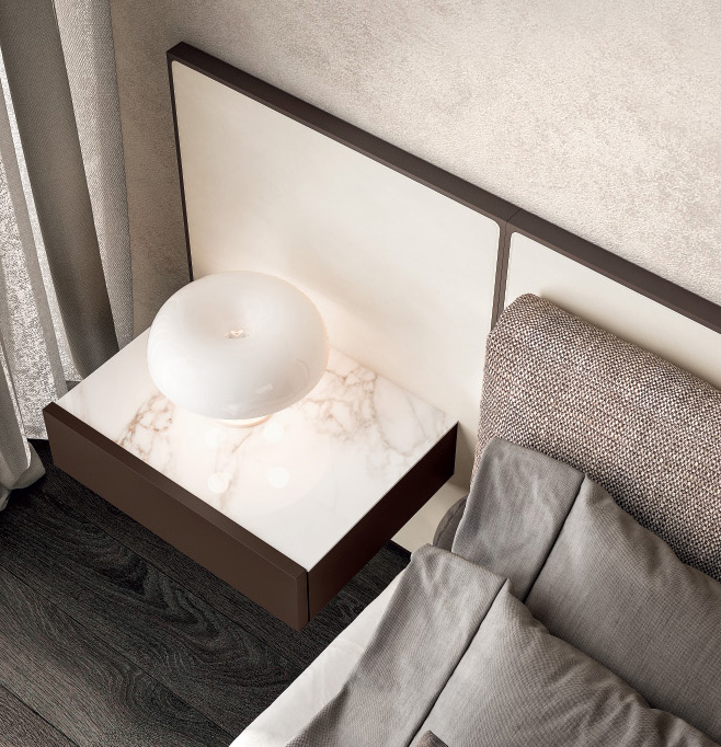 Piedini in metallo e comodini pensili in legno con top in ceramica.