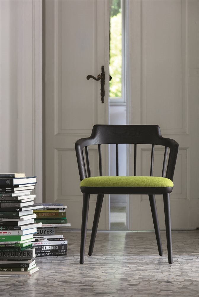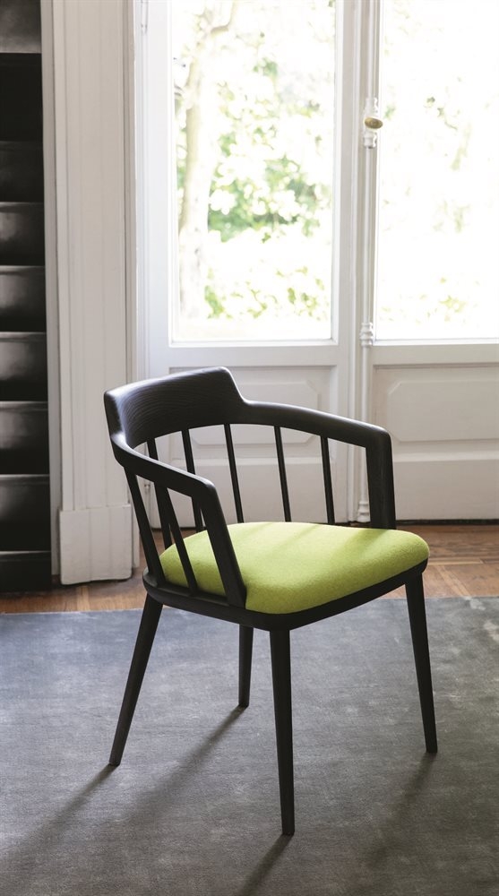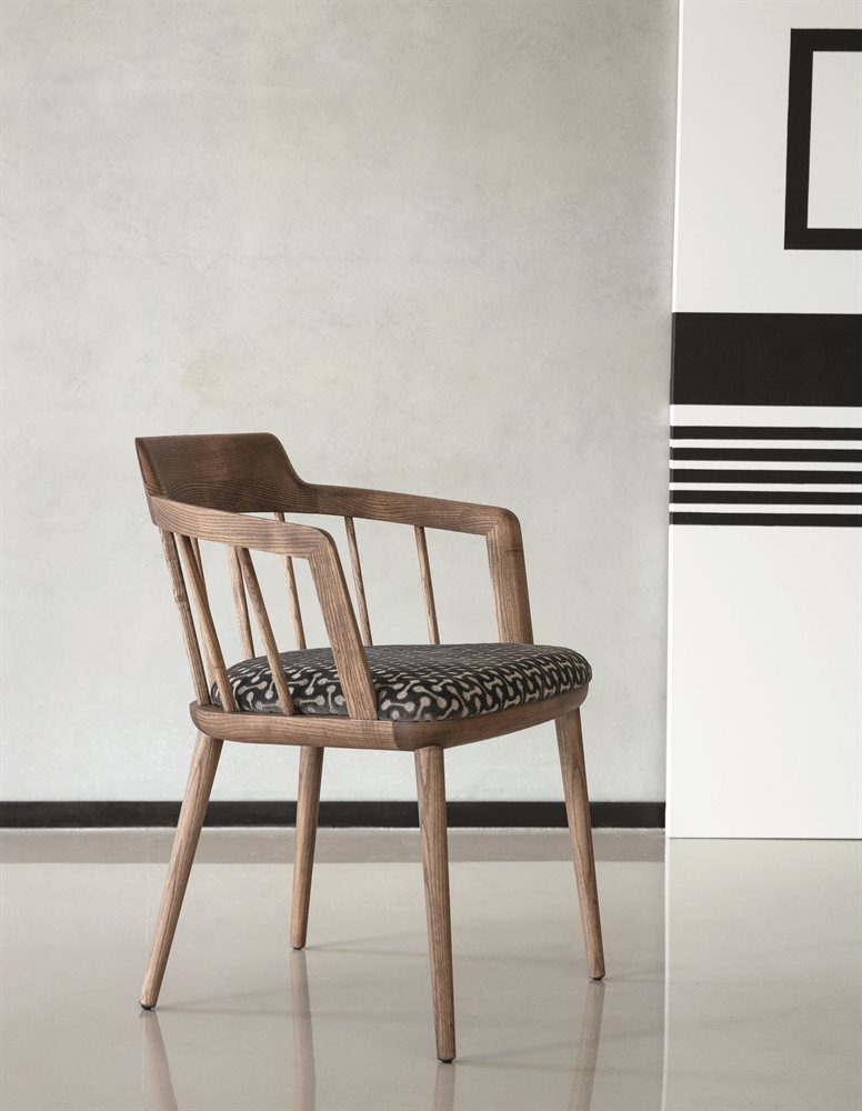 Sedia con braccioli con struttura in massello di frassino e sedile imbottito con rivestimento nei tessuti della collezione.