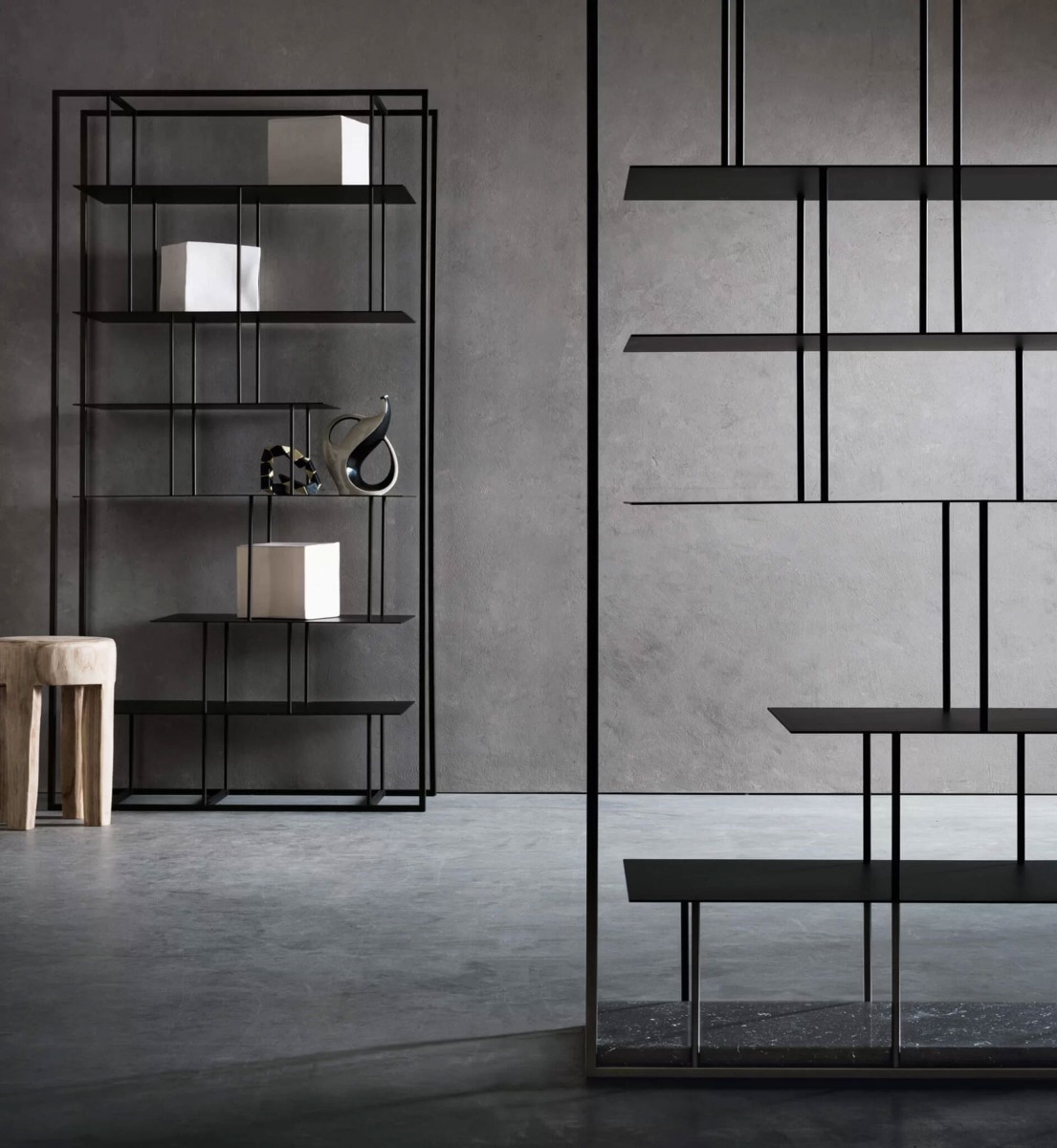 Libreria in metallo finitura antracite, disponibile nella versione a parete o freestanding con basamento in marmo antiribaltamento.