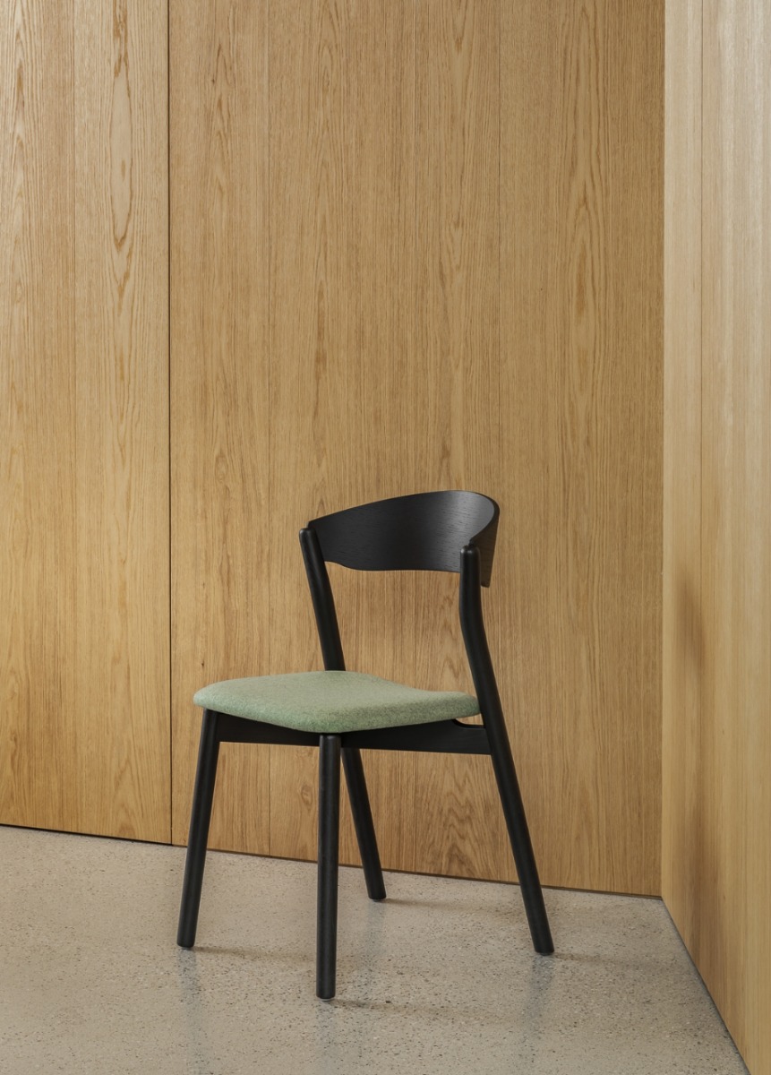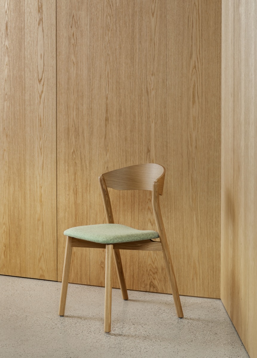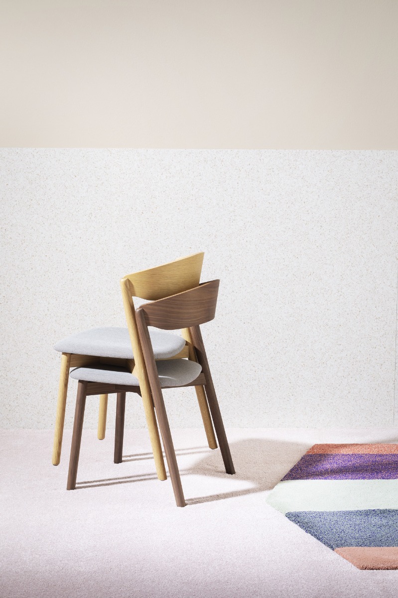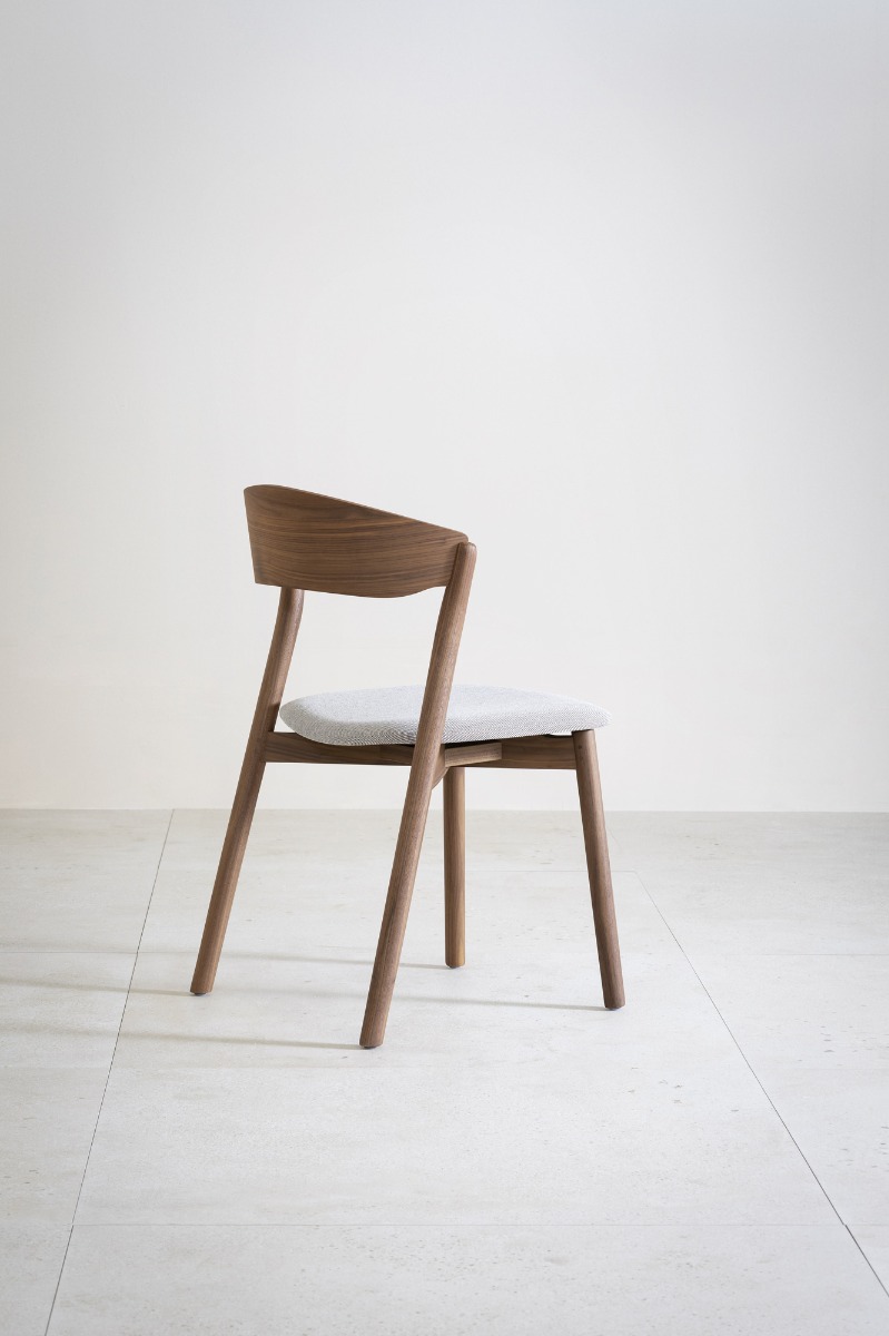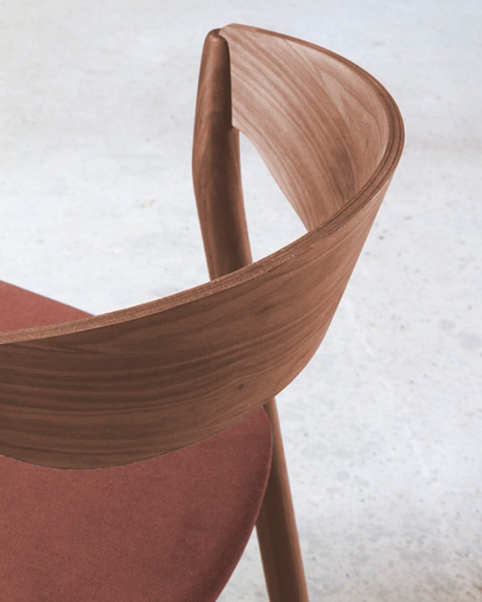 Sedia con struttura in faggio, noce canaletto o rovere. La seduta è nella stessa essenza della struttura oppure rivestita nei tessuti elencati.